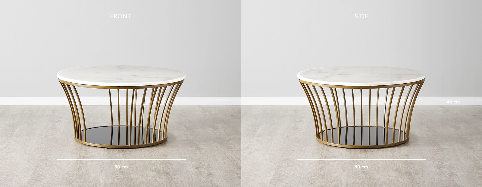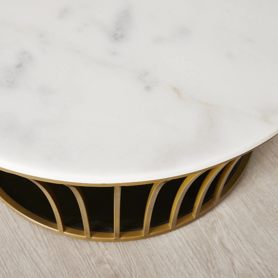 Supported by a stunning stainless-steel frame with a brushed bronze finish, combining stability and style. A black circular base complements the white marble, adding contrast, storage, and functionality to any living room.