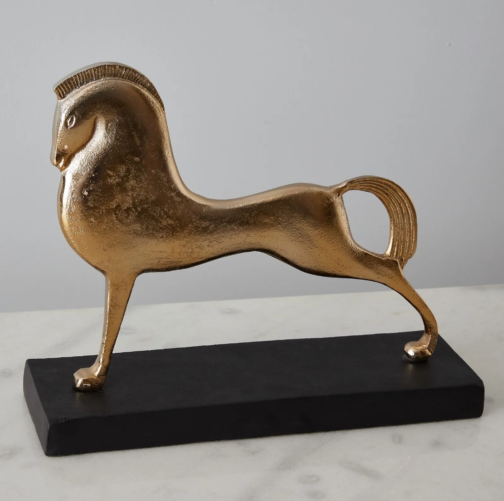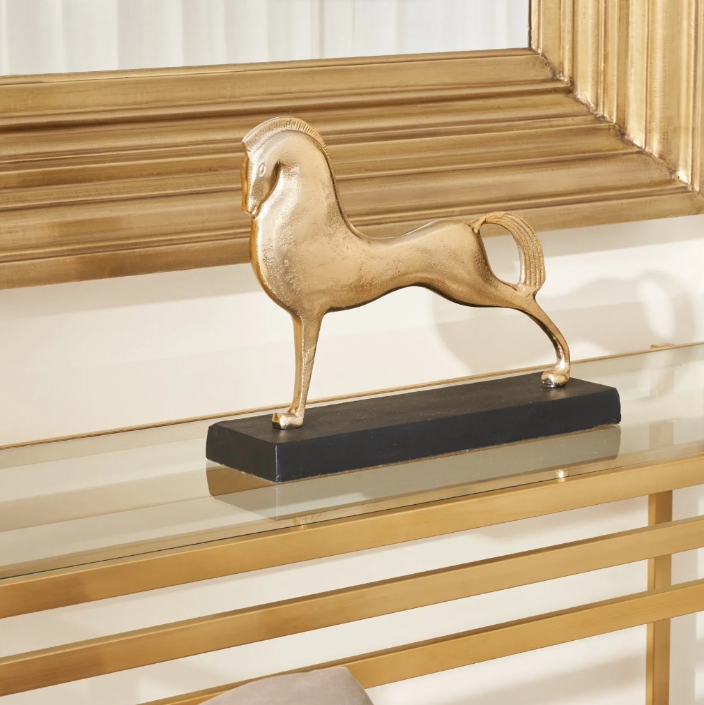 Mounted on a sleek black base, the contrast between the radiant gold and the deep black further accentuates the sculpture's majestic form. The design of the Palomo Horse is both timeless and contemporary, making it a versatile decorative piece for various interior settings.