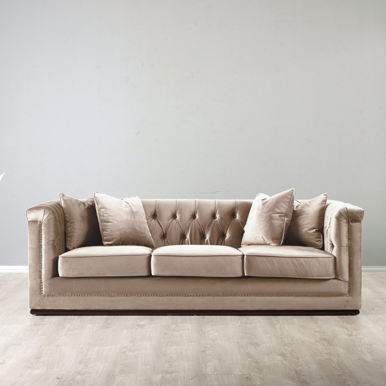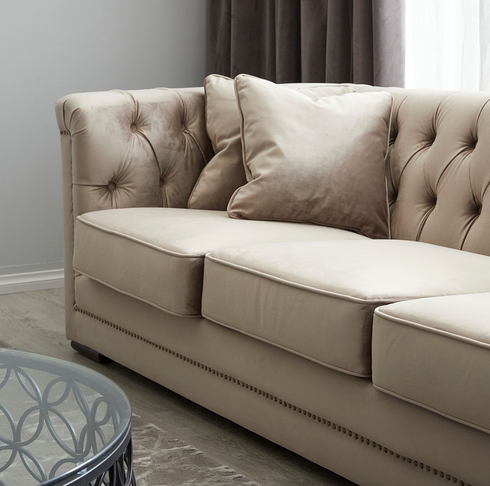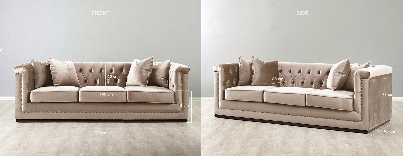 Create a sophisticated space of comfort with the Pascal 3-Seater Sofa. Its Tuxedo design is draped in beige velvet fabric, adding warmth to its luxe look. Each seat features dense foam for comfort.