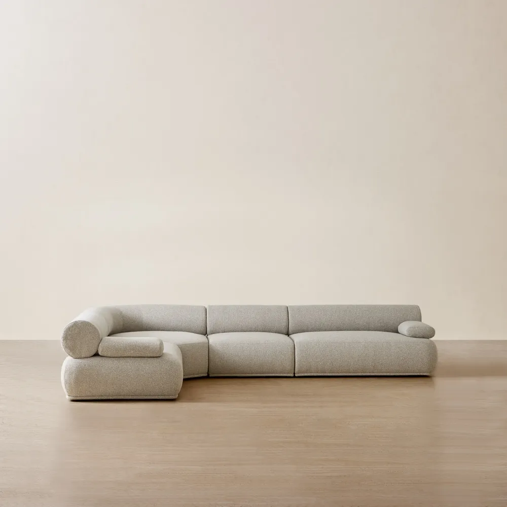 The Pebbla Modular Corner Sofa is wrapped in Tuscan sand fabric, offering a soft, modern texture with a warm, modish tone. Its low-profile frame and distinctive backrest create a sleek, sculptural silhouette that feels contemporary and intentional from every angle.