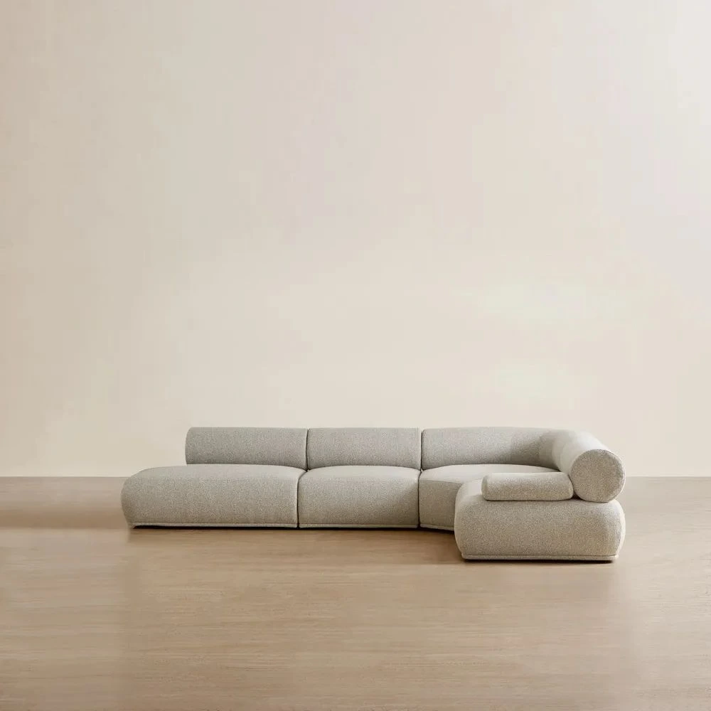 The Pebbla Modular Corner Sofa is wrapped in Tuscan sand fabric, offering a soft, modern texture with a warm, modish tone. Its low-profile frame and distinctive backrest create a sleek, sculptural look that feels contemporary and intentional from every angle.