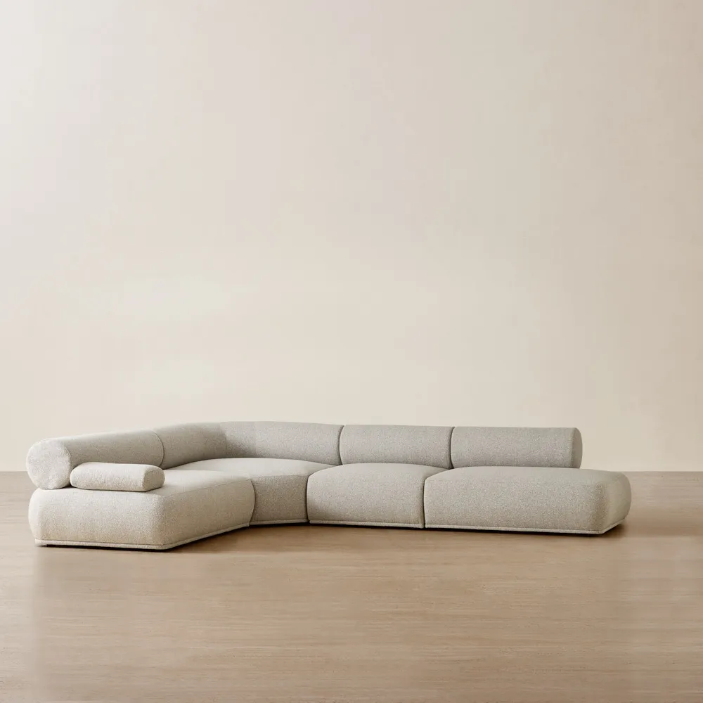 The Pebbla Modular Corner Sofa is wrapped in Tuscan sand fabric, offering a soft, modern texture with a warm, modish tone. Its low-profile frame and distinctive backrest create a sleek, sculptural silhouette that feels contemporary and intentional.