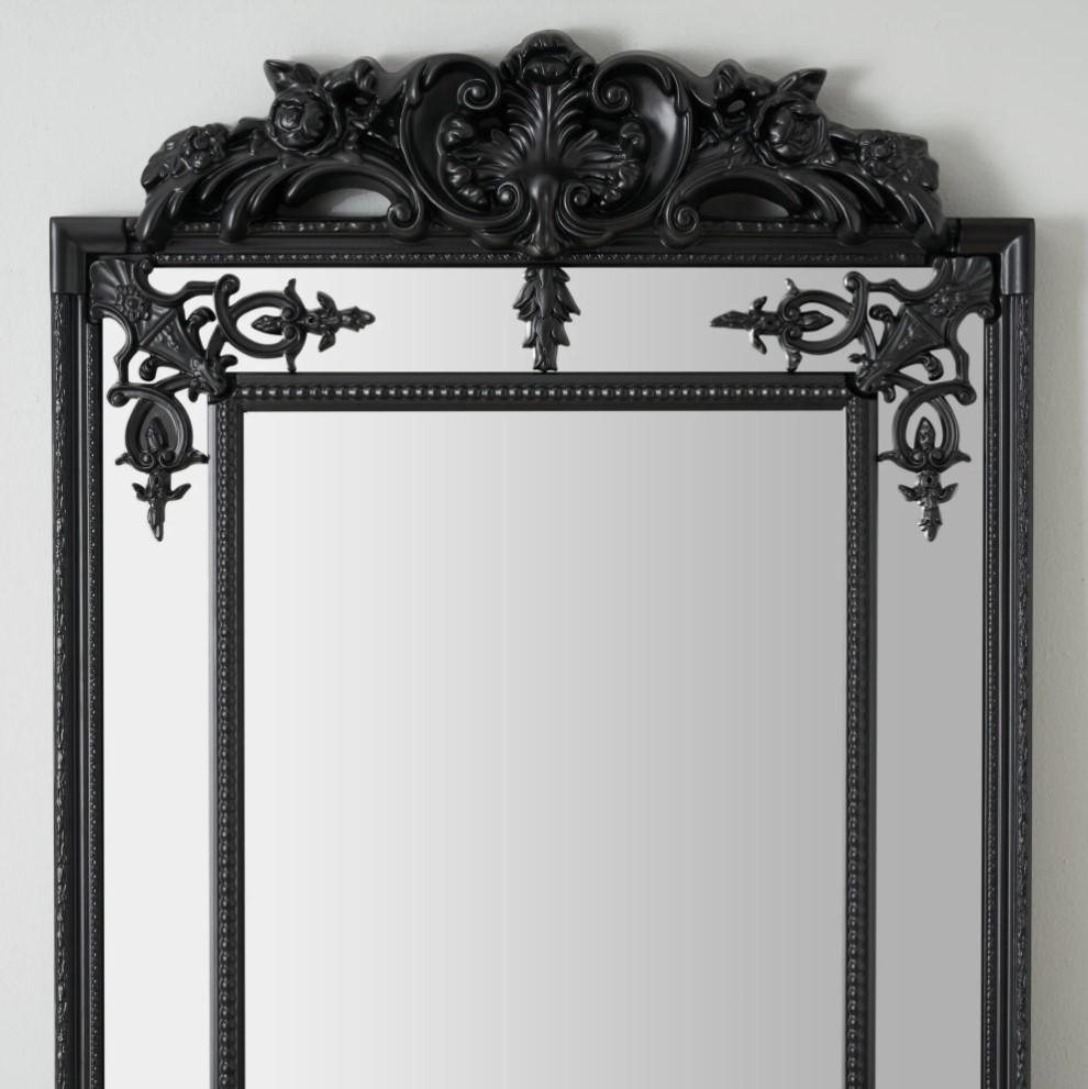 Emanating timeless elegance, the Perry Mirror is an emblem of classic craftsmanship seamlessly interwoven with contemporary design. Encased in a sophisticated black-finished frame, its rectangular profile is accentuated by intricate ornate designs, adding depth and grandeur. The subtle beveled detailing around its edges enhances its overall appeal, catching light in a subdued yet enchanting manner.