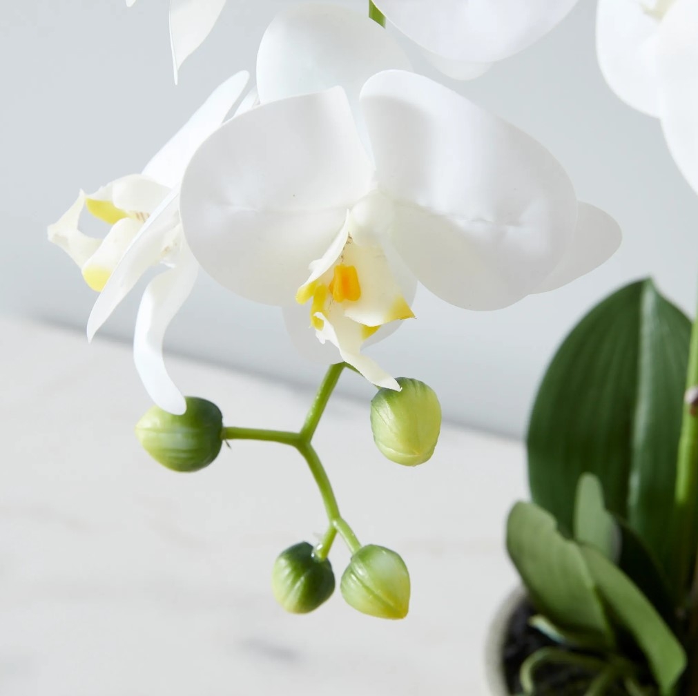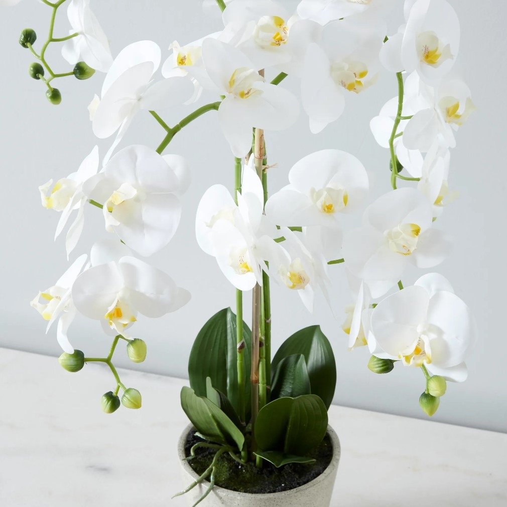 With petals pristine and pure as snow, the 73cm Phalaenopsis Decorative Plant with Pot dazzles with an abundance of beautiful white orchids. At the heart of each orchid, a vibrant yellow centre emerges, adding a touch of warmth. These elegant blooms, arrayed gracefully along lines, transform any space into an inviting oasis of calm.
