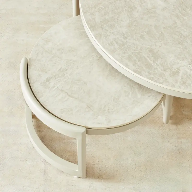 Perfect for modern living spaces, the round surfaces create a welcoming focal point while providing flexible arrangements for entertaining or everyday use. The sintered stone tops add a refined touch, blending durability with understated elegance.