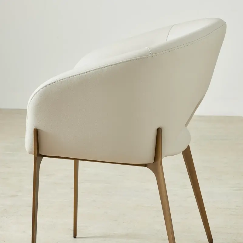 Generously padded for comfort, the seat and backrest provide supportive seating for long meals and conversations. Slim tapered bronze-finish legs complete the design, adding warmth and a sophisticated metallic touch.