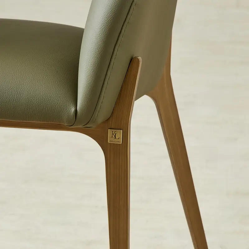 The Polina Dining Chair pairs smooth sage green vegan leather with a gracefully curved backrest for a look that’s both modern and inviting. Its open-back design lends an airy elegance that complements a variety of dining spaces.