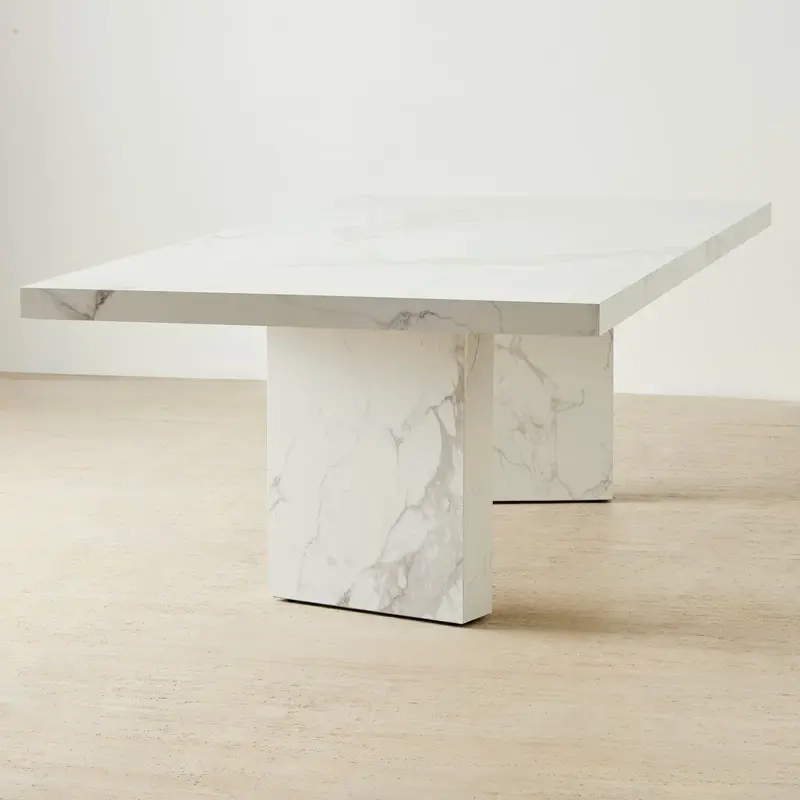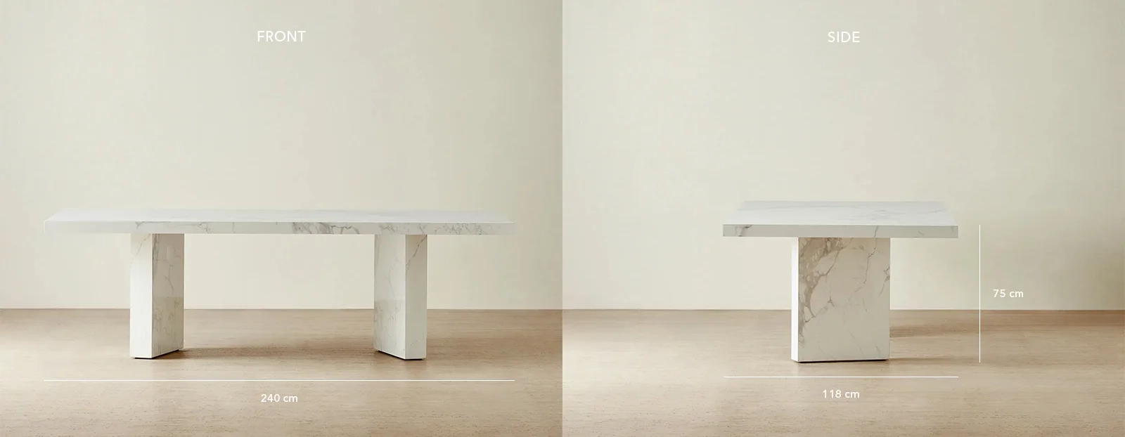 The Port Lucienne Dining Table has a striking monolithic presence with its bold slab design. Crafted from sintered stone, it offers the look of natural marble.