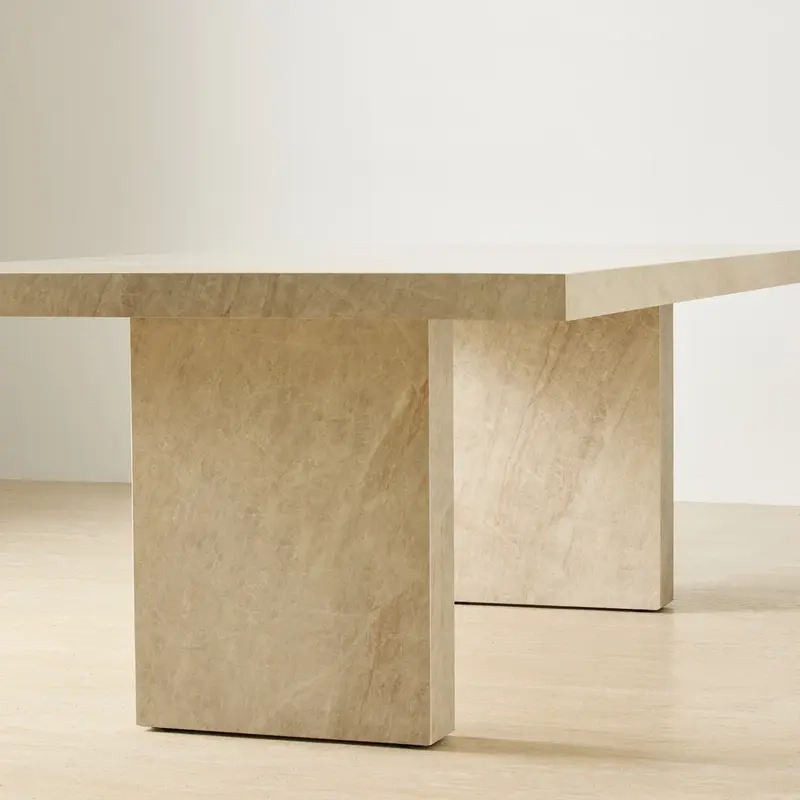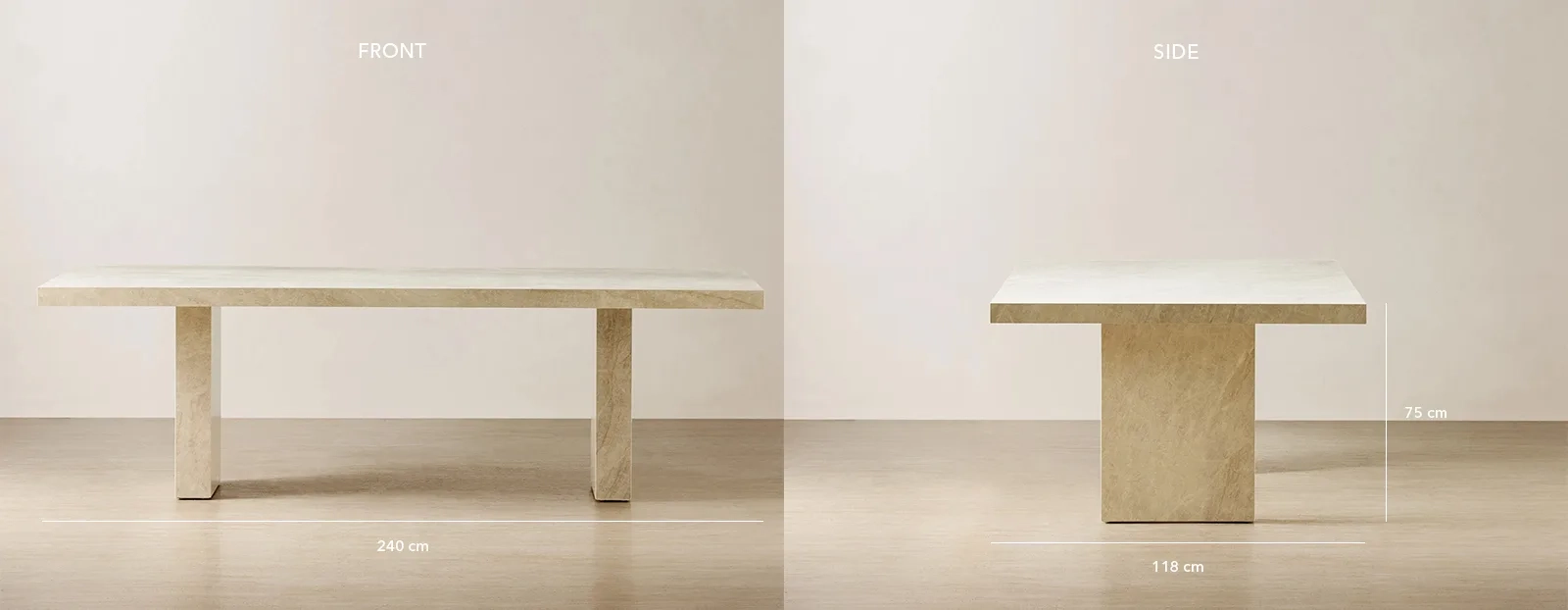 The Port Lucienne Dining Table commands attention with its striking monolithic silhouette and bold slab construction. Crafted from Taj Mahal sintered stone, it delivers the warm, veining and elegance reminiscent of the prized quartzite.