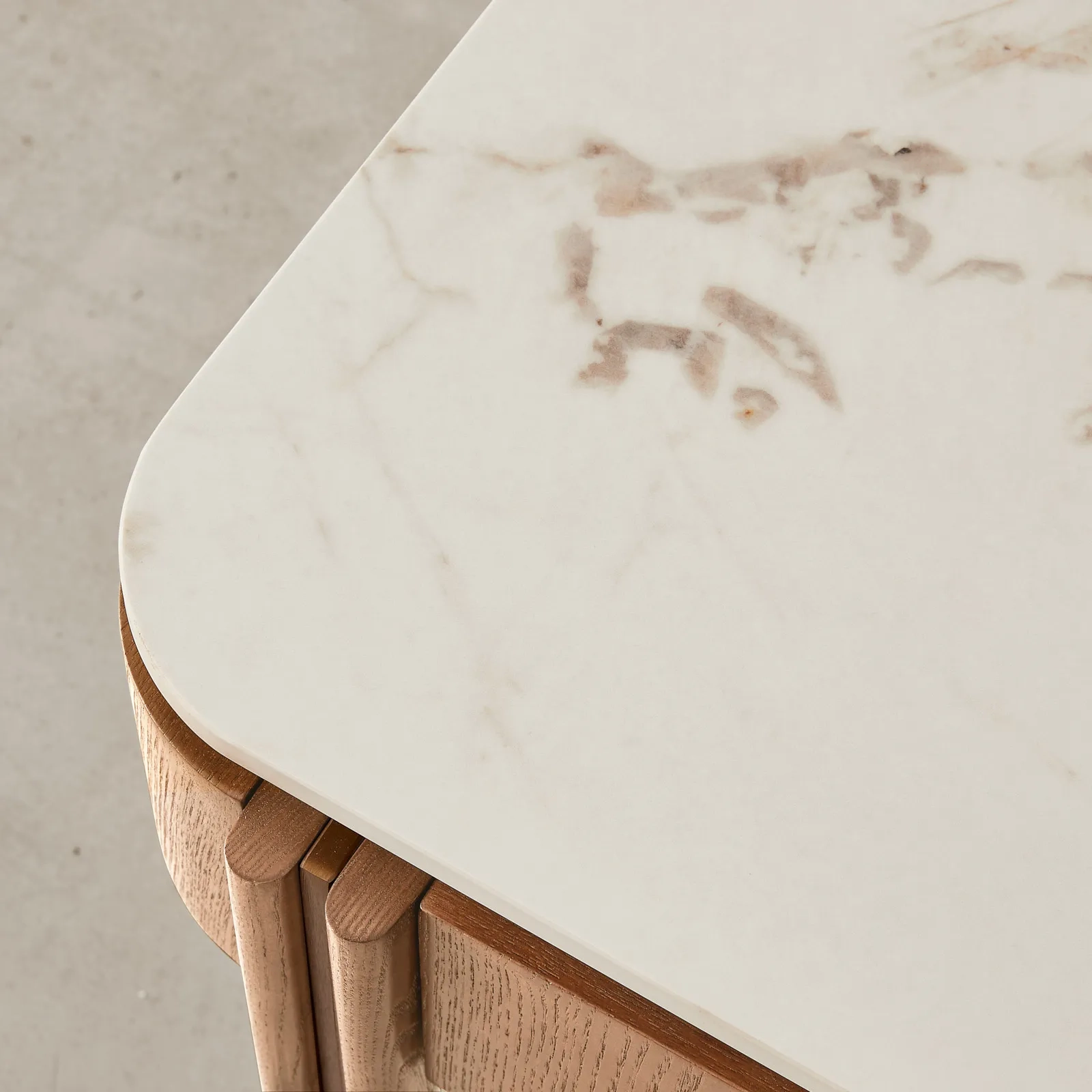 The Portobello collection, featuring elegant veneer and refined sintered stone tops, embodies a quiet sophistication and timeless charm. During a visit to Porto, Portugal, Bianca Armenion drew inspiration from the city's ancient beauty and rich textures, which led to the creation of the collection's veneer frames. While exploring Porto, Armenion was captivated by the rugged cliffs and natural landscapes, inspiring her to design the elegant, sintered stone tops that reflect the serene beauty of the city's surroundings. The Portobello collection seamlessly brings this tranquility and elegance into modern homes, capturing the serene and sophisticated essence.