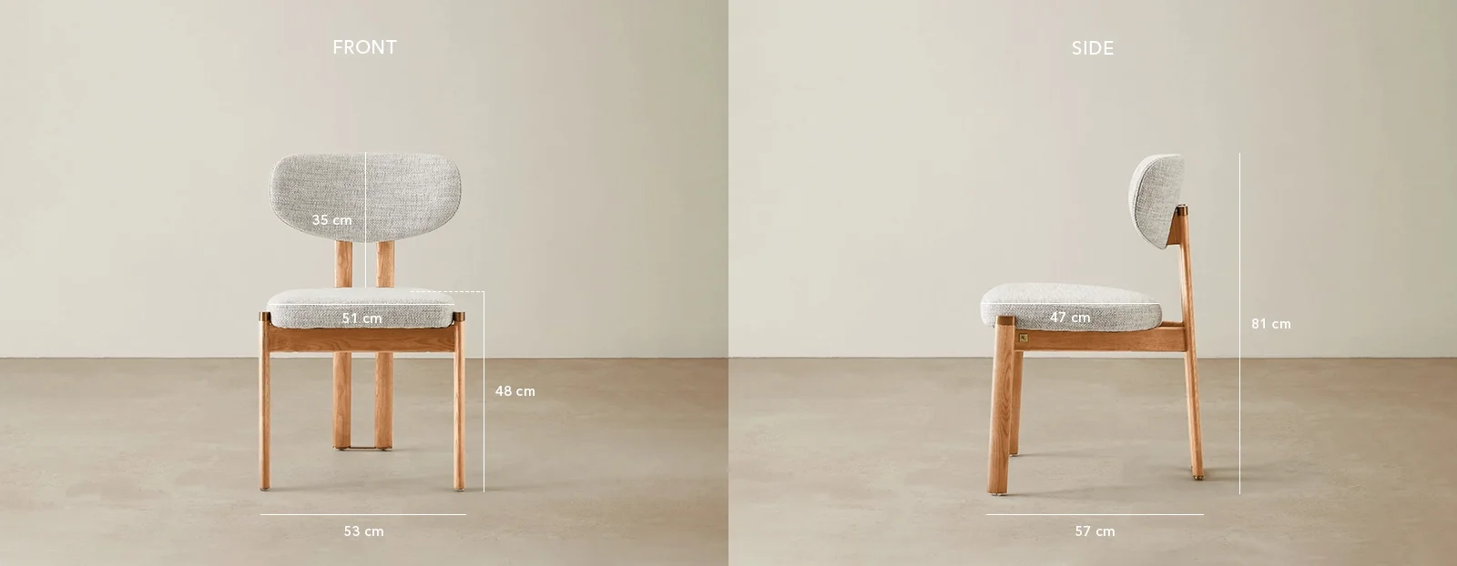 The light brown ash legs lend a grounded warmth, their clean lines enhancing the chair’s sculptural form. Subtle brass accents complete the design, bringing a quiet sophistication to any dining setting.