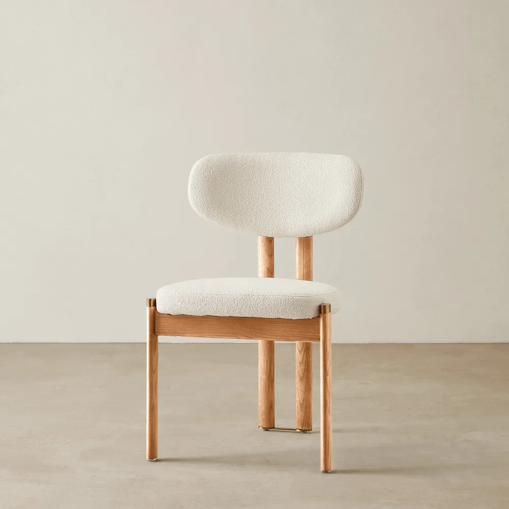 Set on light brown ash legs, the chair’s organic tones and clean lines bring warmth and balance to the dining space. Finished with subtle brass accents, it embodies modern elegance with a timeless touch.