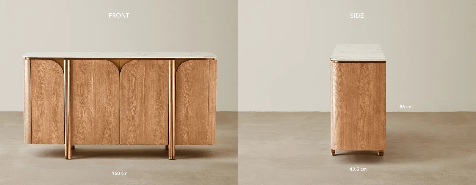 The Portobello Sideboard combines natural appeal and modern style. Its light brown veneer body, with visible rings and grain patterns, pairs well with the smooth sintered stone top, creating a cohesive piece.