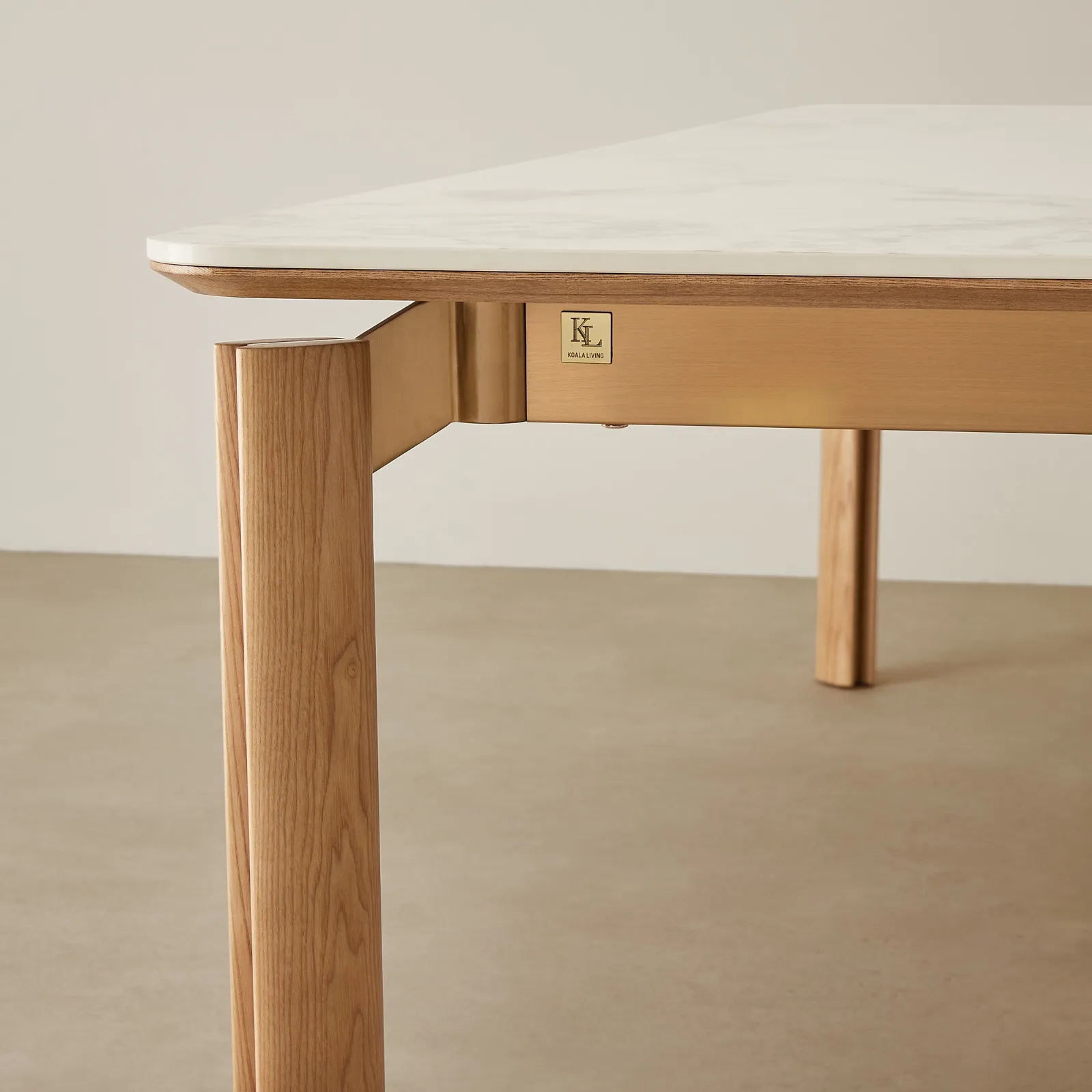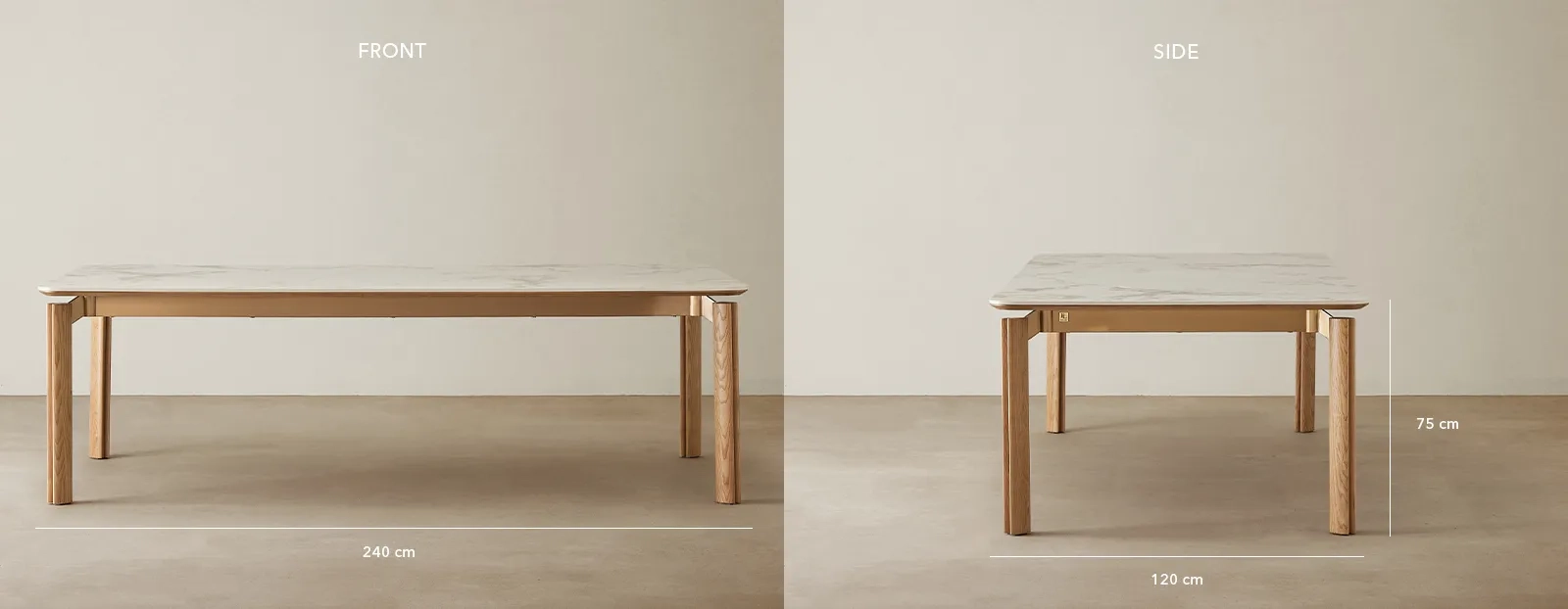 The table's design gracefully transitions into toffee brown ash legs. These legs, with their lighter, honeyed hues, impart a sense of warmth and natural charm. They stand with a quiet but confident presence, supporting the stone top with an effortless blend of strength and aesthetics. The toffee brown tone of the ash wood complements the creamy sintered stone, lending a welcoming, softer look that suits a variety of interior palettes.