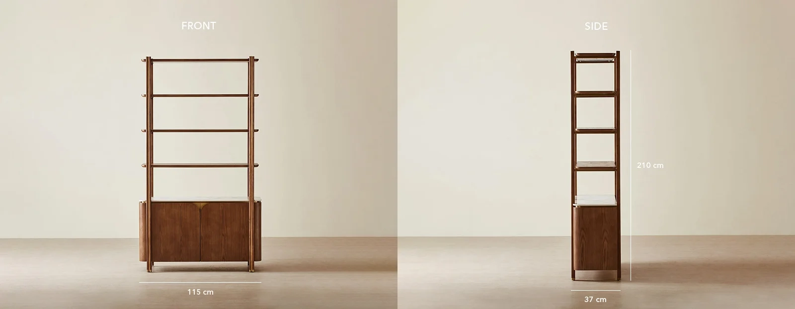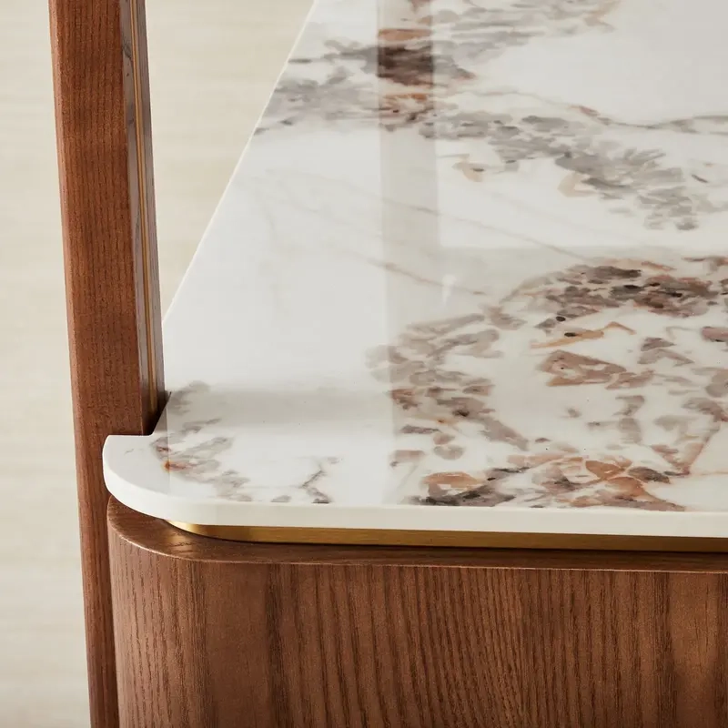 The Portobello Toffee Brown Ash Veneer Shelf features open shelving and a sintered stone top, combining style and function.