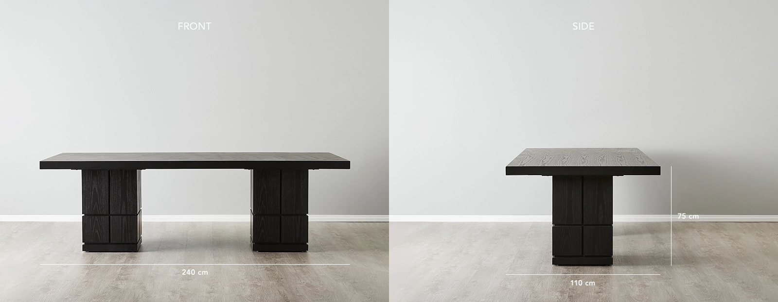 The table is supported by two wooden columns adorned with bold borders, resembling stacked cubes that add a unique sense of majesty and visual interest to the piece. Complete the look by pairing the Portofino II Black Wooden Dining Table with our beautiful range of dining chairs. Whether it's an intimate family dinner or a festive gathering, the Portofino Dining Table sets the stage for unforgettable moments and lasting memories.