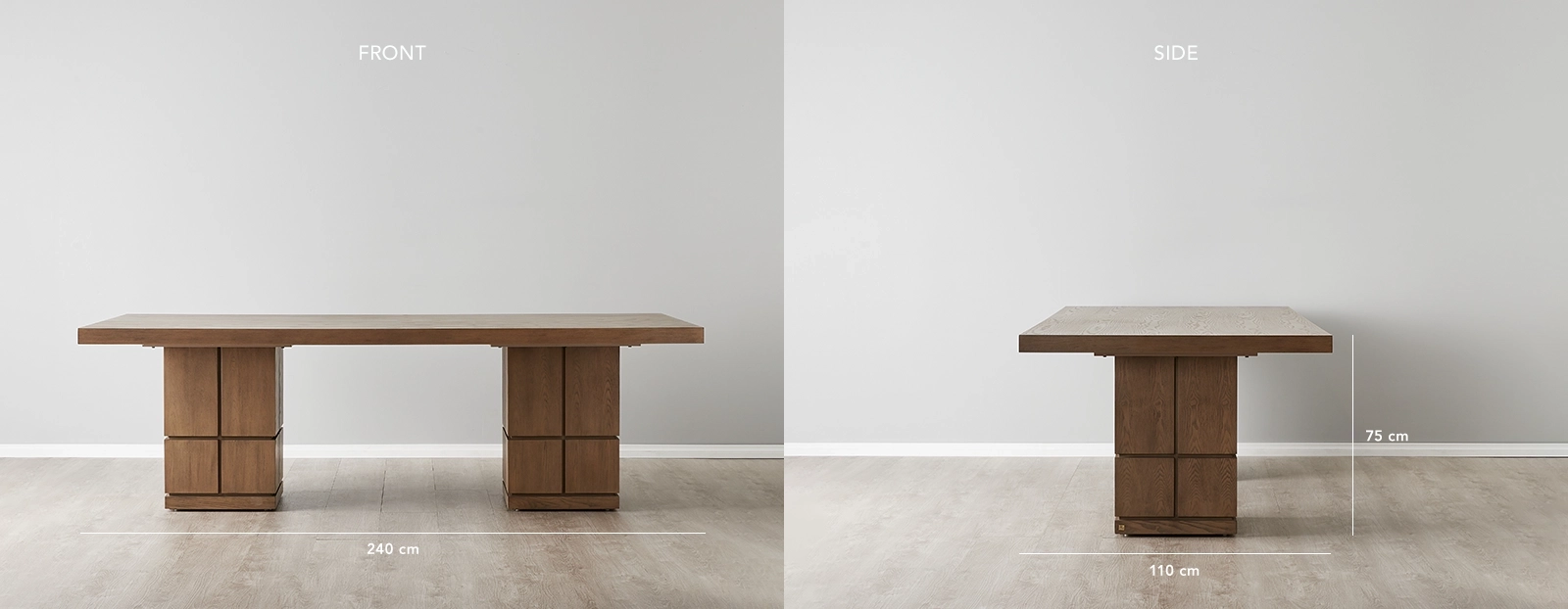 Supporting the table are two distinct wooden columns, adorned with bold borders. These pillars, resembling stacked cubes, introduce a unique sense of structure and visual intrigue, adding layers of depth to the overall design. To achieve the ultimate contemporary dining experience, consider pairing the Portofino II Brown Wooden Dining Table with our exquisite range of dining chairs.