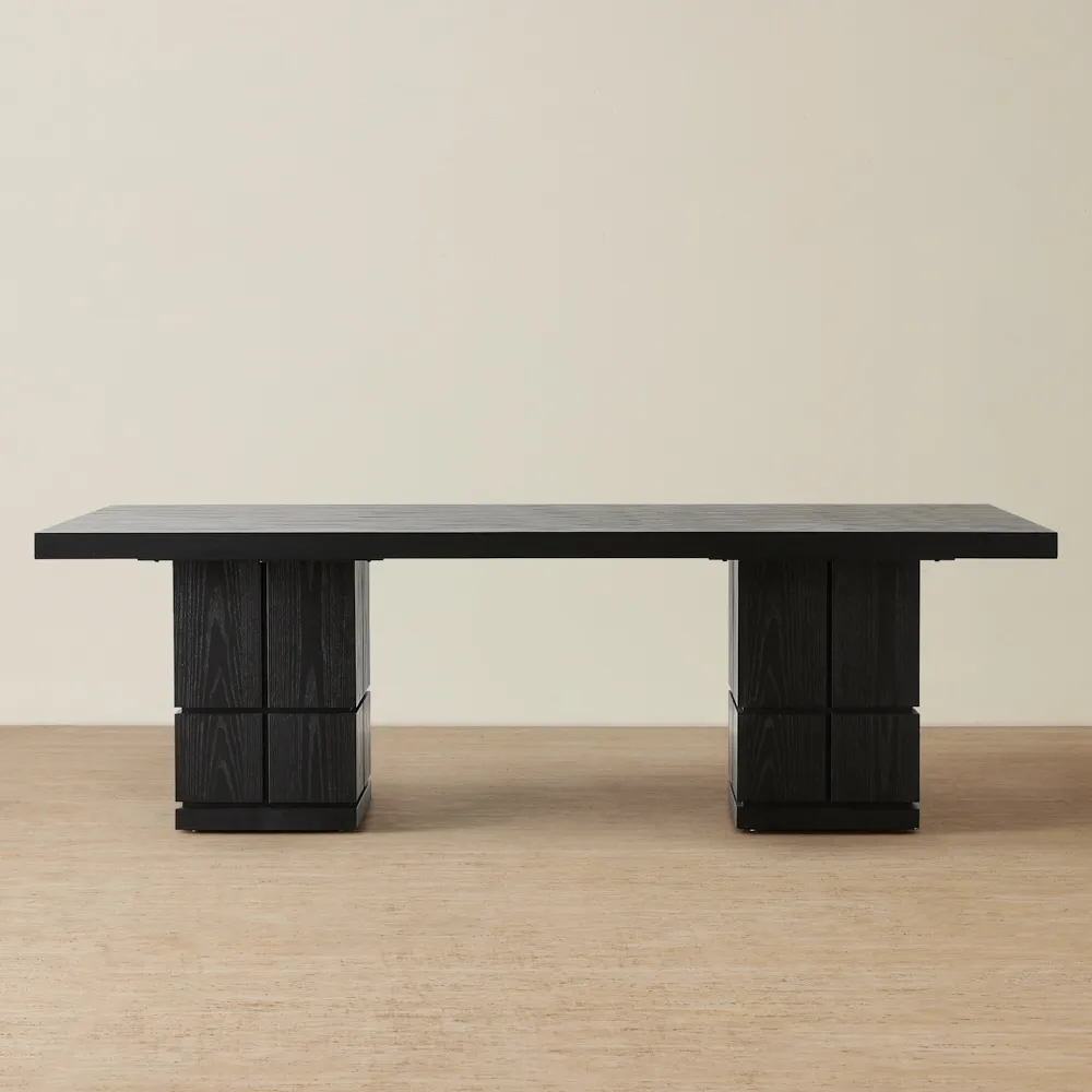 Supporting the table are two distinct wooden columns, adorned with bold borders. These pillars, resembling stacked cubes, introduce a unique sense of structure and visual intrigue, adding layers of depth to the overall design. To achieve the ultimate contemporary dining experience, consider pairing the Portofino II Brown Wooden Dining Table with our exquisite range of dining chairs.
