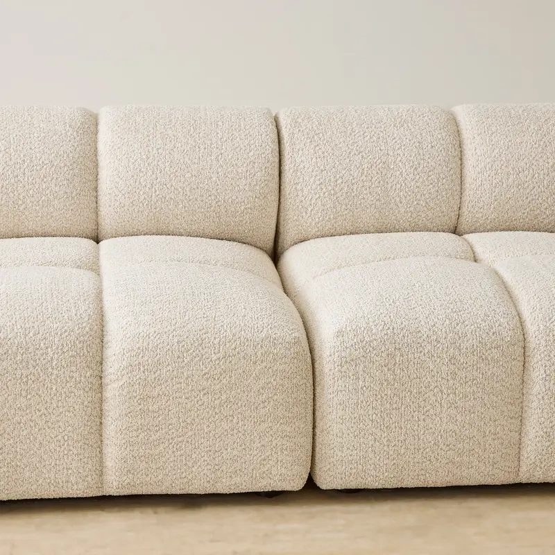 The Quincy 3-Piece Modular Sofa is built with a rounded, low-profile form that gives each piece a smooth, sculpted look. Its stone cream woven fabric adds soft texture and a warm, versatile tone suited to modern living spaces.