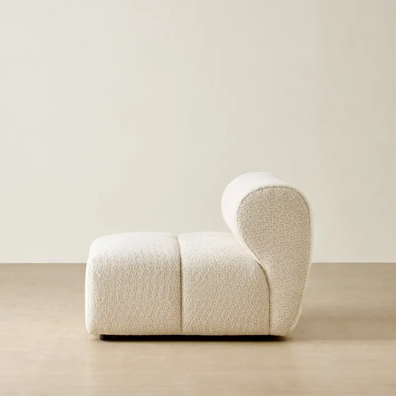 The Quincy Armless Module is shaped with a rounded, low-profile form that keeps the silhouette smooth and versatile. Upholstered in stone cream woven fabric, it brings soft texture and a warm, relaxed look that settles easily into any setting.