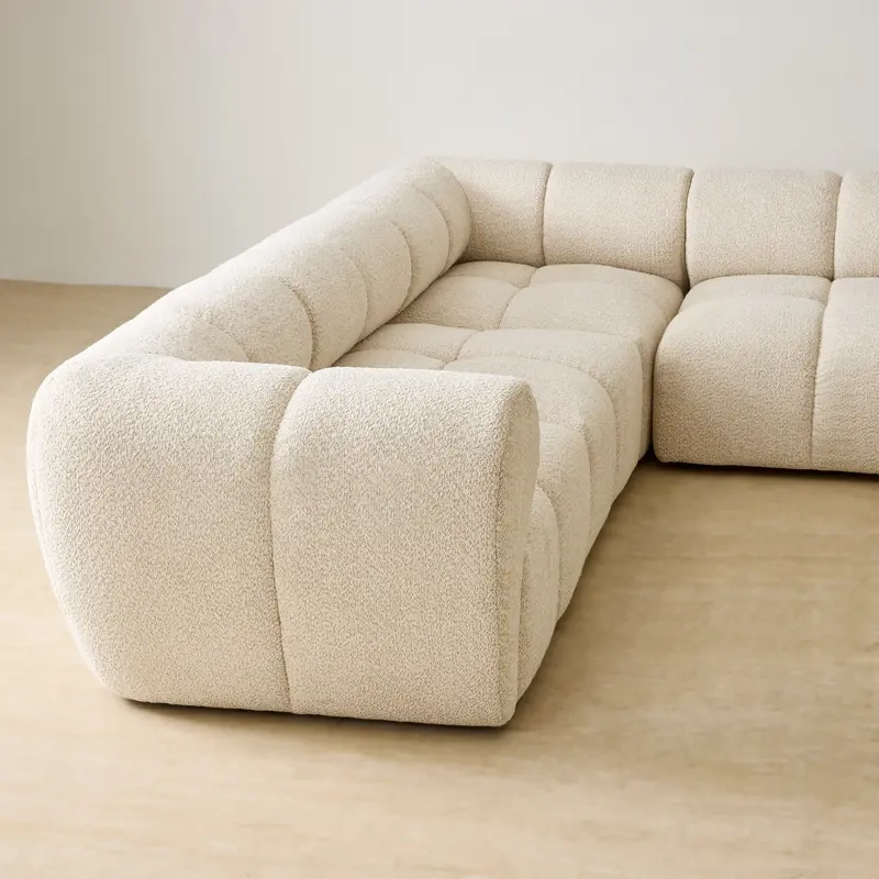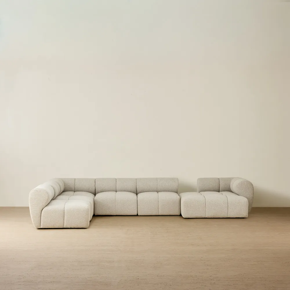 The Quincy Modular Sofa showcases a rounded, low-profile form that gives each piece a smooth, sculpted look. Its soft, textured upholstery brings a warm, inviting feel that works naturally in open living spaces.
