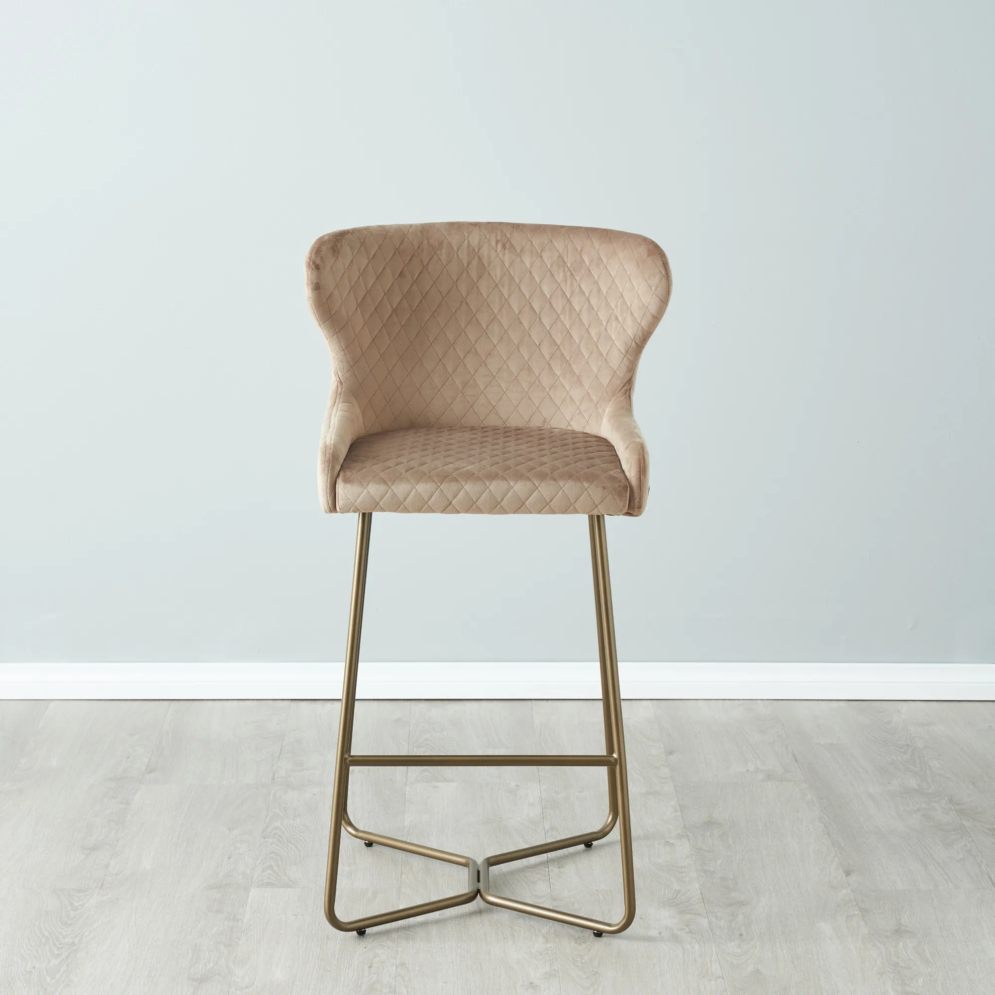 Elevate your interiors with the Quinn Bar Stools, a splendid amalgamation of simplicity and elegance. The Quinn Beige Velvet Bar Stool is more than just a seat - it's a statement of style, featuring a sleek seat upholstered in sophisticated Beige coloured velvet fabric. The striking criss-cross motif adorning the fabric enhances the stool's allure, imparting a layer of opulence to its overall aesthetic. This unique presentation, with its art-deco-inspired design, seamlessly infuses a dash of vintage glamour into contemporary home settings.