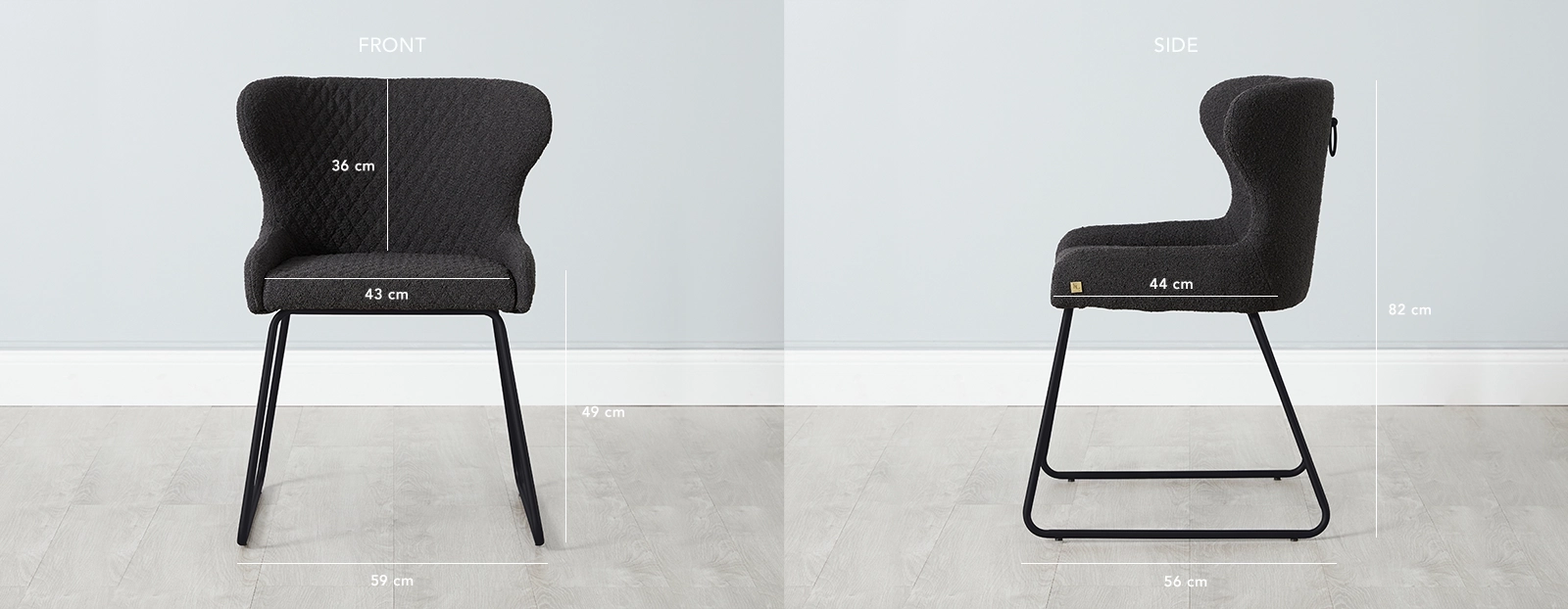 Liven up your homes with the captivating beauty of our Quinn Chairs. The Quinn Charcoal Boucle Dining Chair is a true embodiment of simplicity and elegance, offering a timeless design that effortlessly complements various interior styles. Its stylish charcoal-coloured seat, made of soft boucle fabric, not only adds a touch of sophistication but also provides a cozy and comfortable seating experience. The mesmerizing cross-stitched design that adorns the entire seated area adds a touch of artistry and craftsmanship.