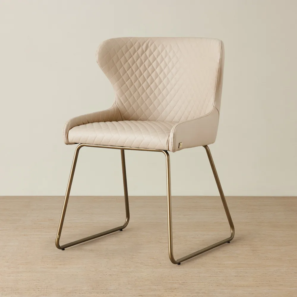 Elegant brass-coloured legs flow gracefully from the base, not only providing stability and support but also adding a touch of luxury to the Quinn Chair. The warm and lustrous brass finish complements the cream seat beautifully, creating a harmonious colour palette that exudes sophistication and refinement. To add a touch of character and uniqueness, a decorative pull ring is placed on the back of the chair. This small yet thoughtful detail adds a charming element to the overall design.