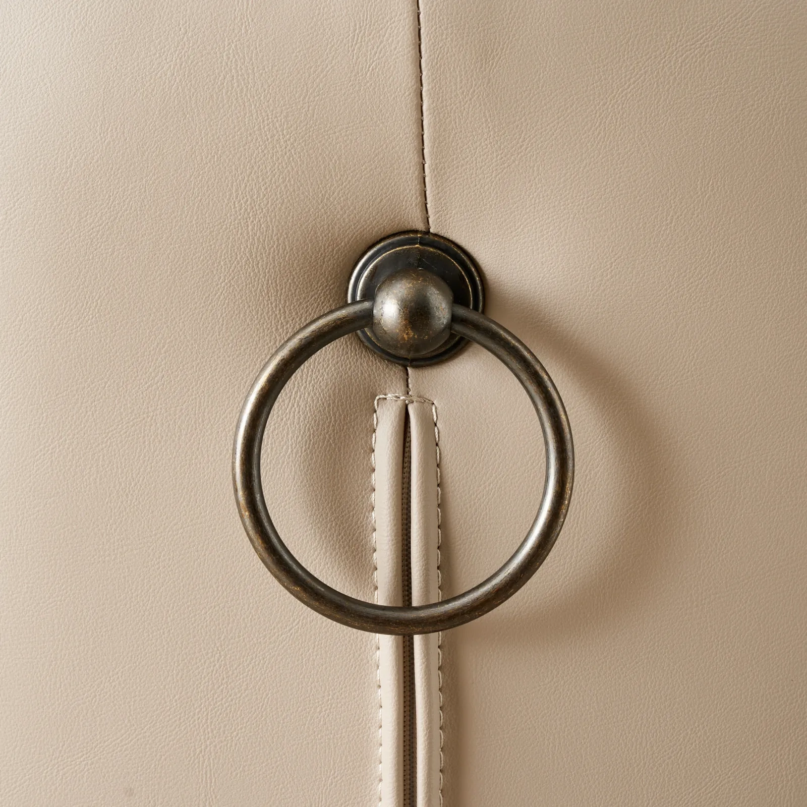 Meticulously crafted, a stylish brass-coloured frame forms the sturdy base of the stool, complementing its rich beige-coloured seat. This frame elegantly transitions into an integrated footrest, designed to ensure optimum comfort while enhancing the stool's stability. Adding a touch of whimsy and distinctiveness to the piece is a decorative pull ring on the back, contributing an additional layer of character to the stool's aesthetic appeal. The Quinn Sand Beige Vegan Leather Bar Stool is a medley of luxurious colours and stylized design that make it a thrilling addition to your home decor collection.