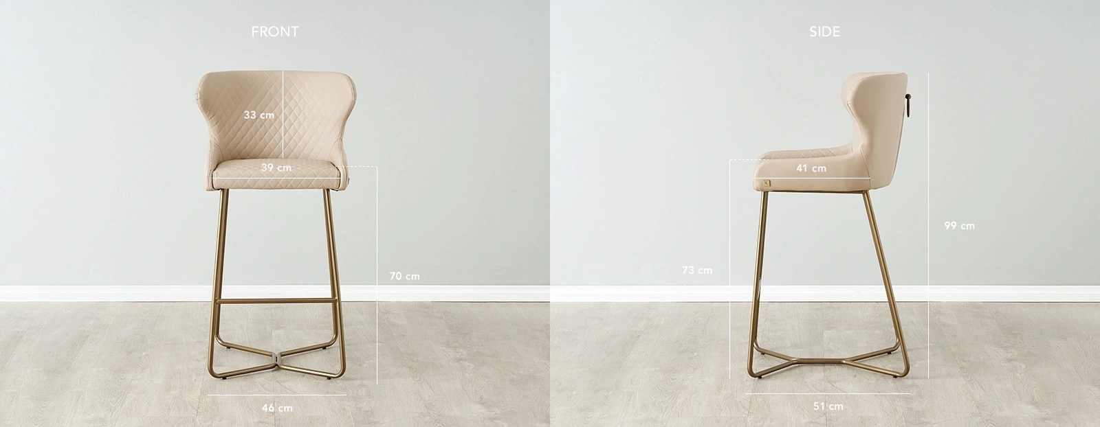 Elevate your interiors with the Quinn Bar Stools, a splendid amalgamation of simplicity and elegance. The Quinn Sand Beige Vegan Leather Bar Stool is more than just a seat - it's a statement of style, featuring a sleek seat upholstered in exquisite sand beige vegan leather. The striking criss-cross motif adorning the fabric enhances the stool's allure, imparting a layer of opulence to its overall aesthetic. This unique presentation, with its art-deco-inspired design, seamlessly infuses a dash of vintage glamour into contemporary home settings.