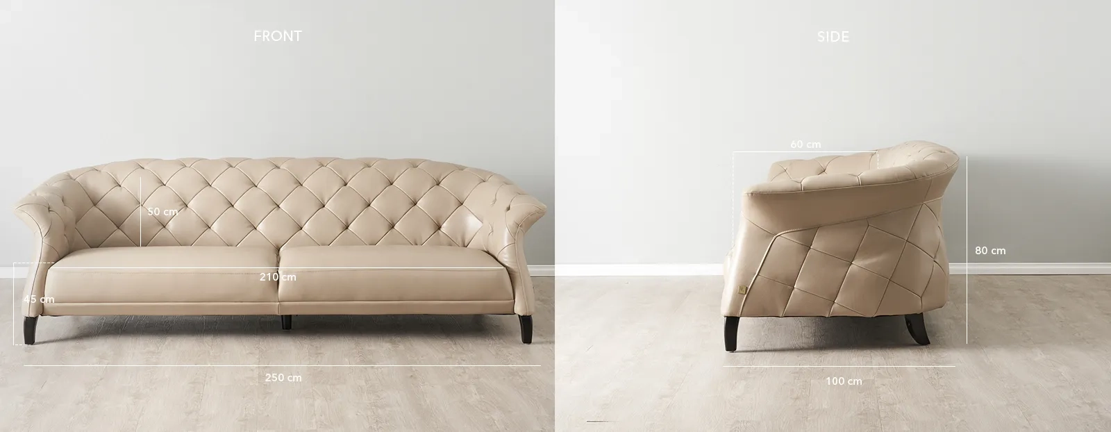 The Regal 3-Seater Sofa features deep, diamond-shaped tufting that adds depth and texture to its appearance. This detailing, combined with taupe-coloured leather, enhances both its look and comfort.