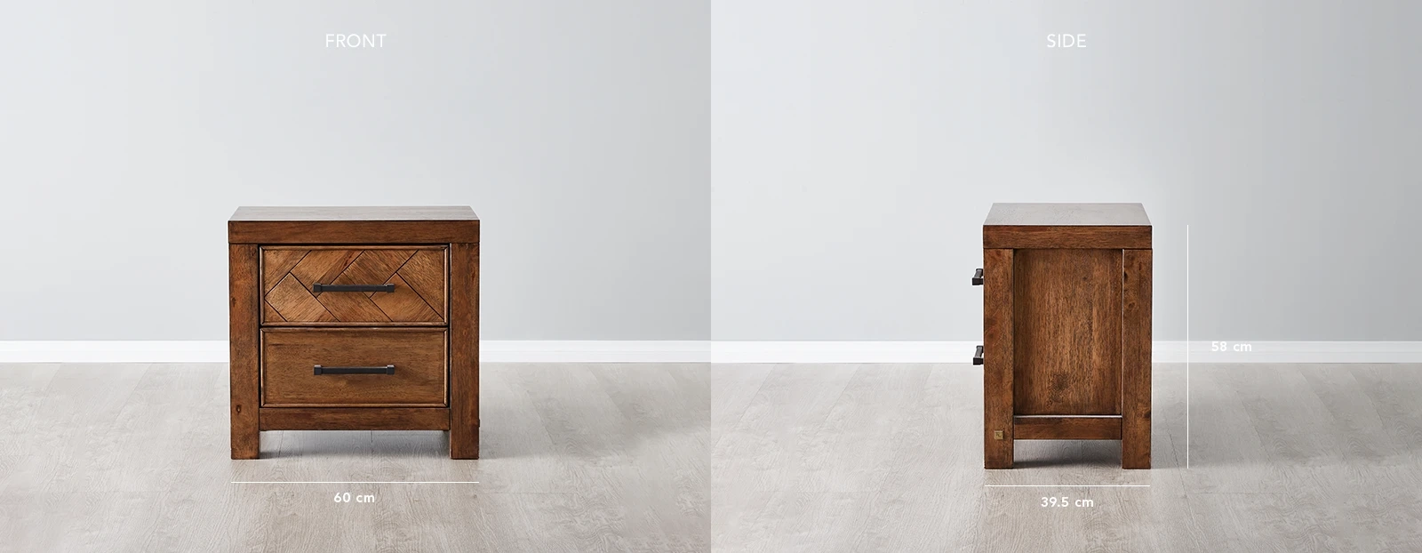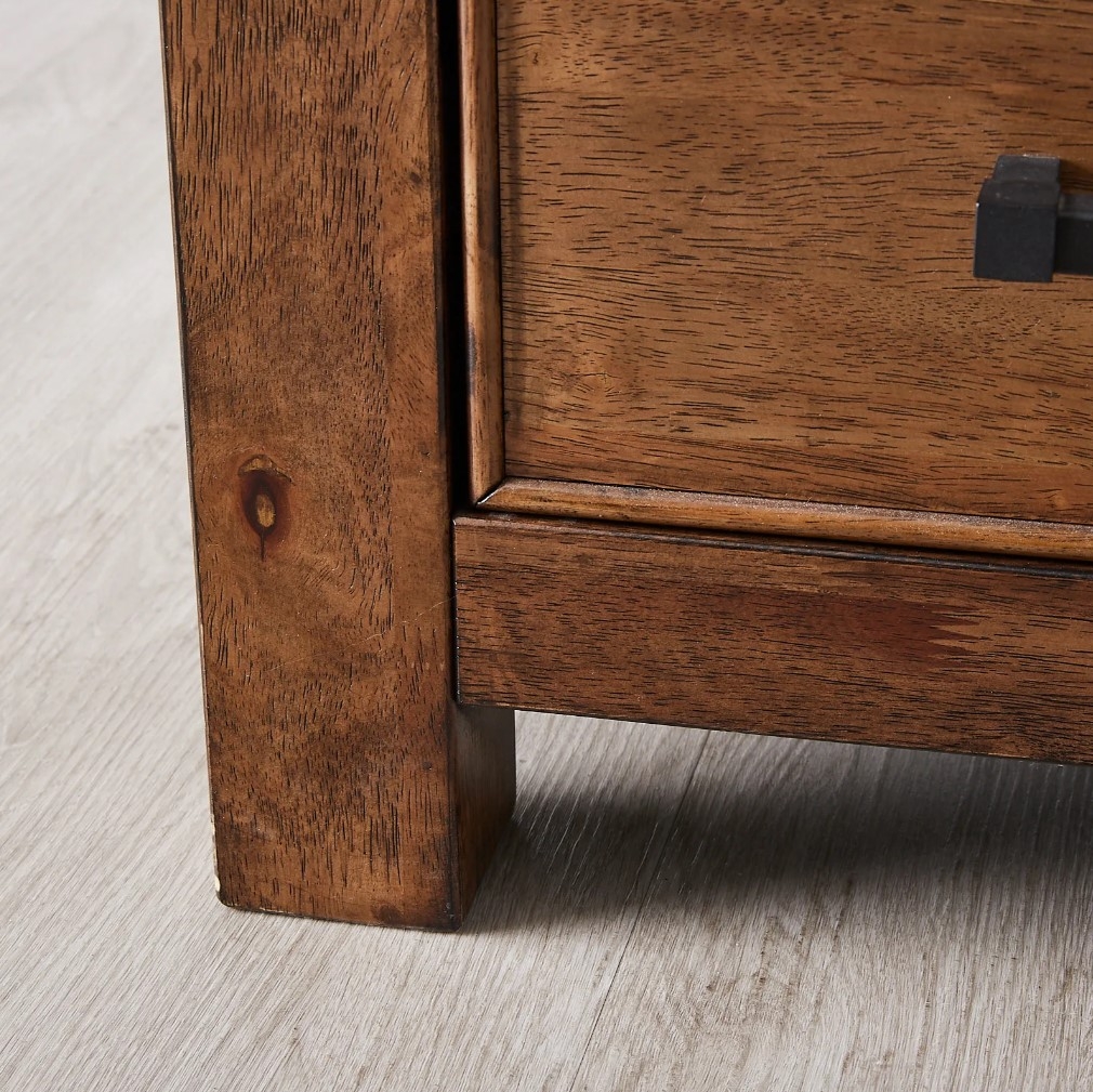 The first drawer face features a woven-like motif that further accentuates its rustic atmosphere. The powder-coated steel handles, while being functional, also add a look of toughness to the overall piece. It Pairs beautifully with our Regina Bed, Dressing Table and Chest Drawer.
