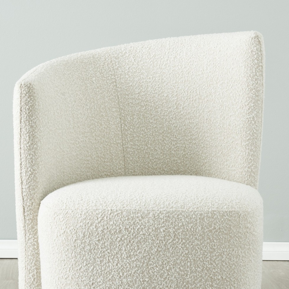 Challenge conventions with the Reina Chairs. The Reina Asymmetrical Cream Boucle Chair brings sophistication with its semi-curved backrest and stylish curves for a glamorous lounging experience.
