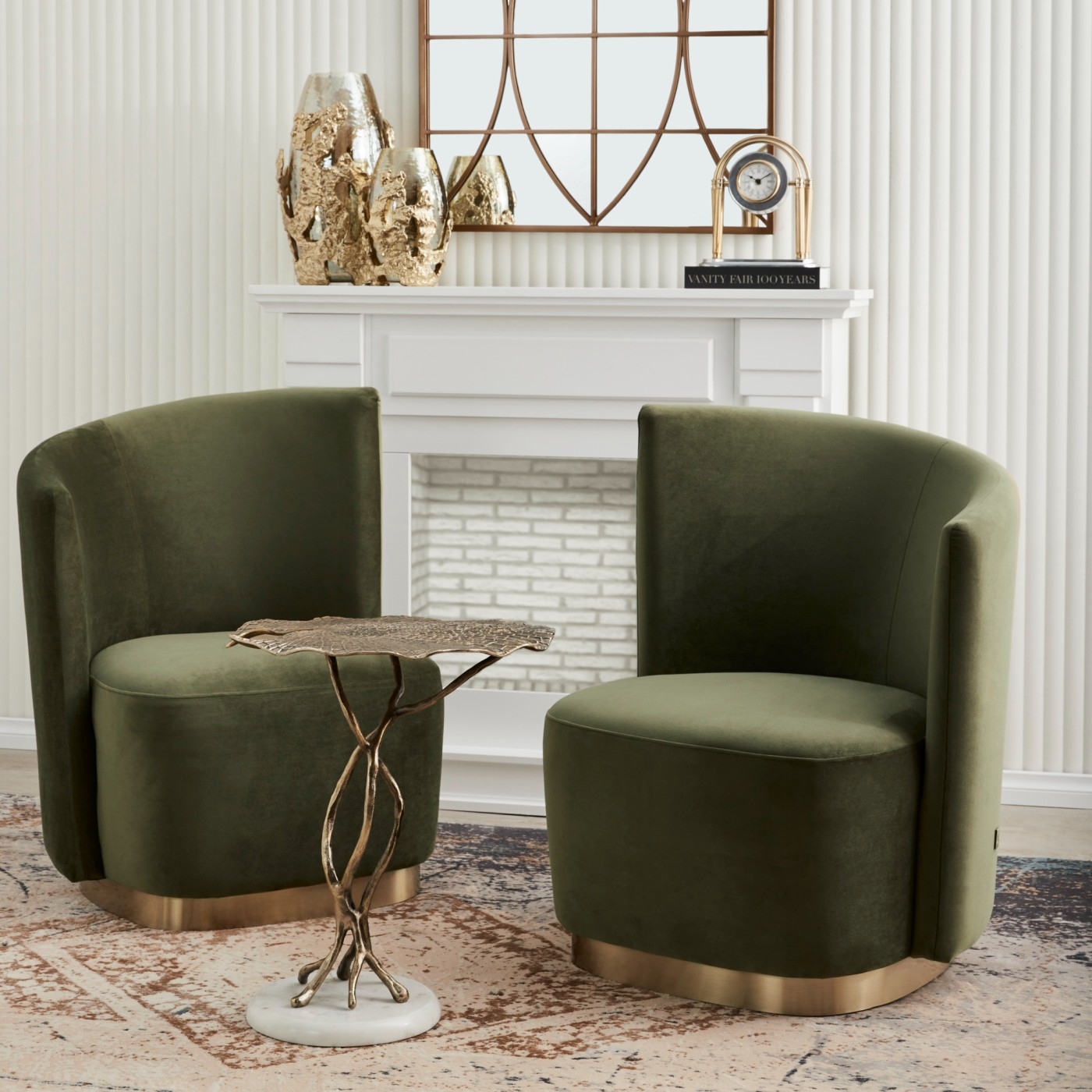 Challenge conventions with the Reina Chairs. The Reina Asymmetrical Olive Green Velvet Chair brings sophistication with its semi-curved backrest and stylish curves for a luxurious lounging experience.