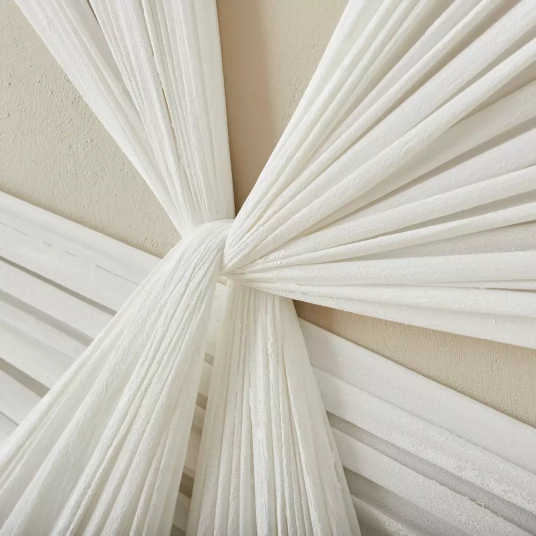 Rich Rhythm captivates with its striking blend of texture and form, showcasing elegantly draped white fabric stretched in dynamic, radiating patterns.