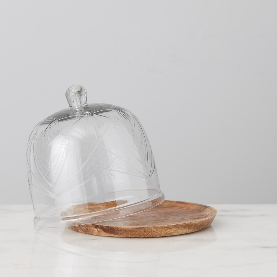 The Rico Glass Cloche is an elegant addition that brings an instant sense of refinement and sophistication to your dining room. This beautifully designed piece is composed of two harmonious parts that together create a perfect balance of function and style. The first component of the Rico Glass Cloche is its base, a circular tray crafted from high-quality wood. This tray boasts a rich, beautiful brown color, exuding warmth and natural charm.