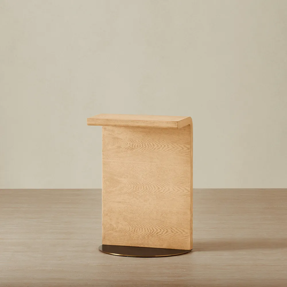 The sleek, curved profile is designed to fit over a sofa arm, offering convenience and style. Ideal for compact spaces, this table offers a functional surface for drinks, books, or decor, elevating your room with its contemporary elegance.