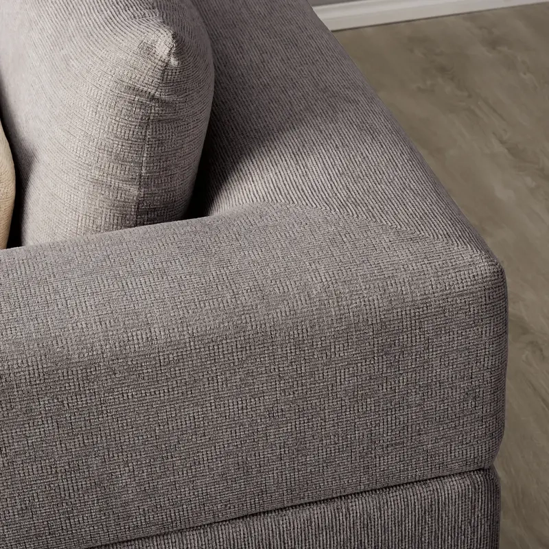 The Riviera III Graphite 2 Pieces Modular Fabric Sofa is wrapped in soft, woven graphite fabric, offering a luxurious feel and a bold, modern look. Its deep, neutral tone adds sophistication to any space, while the included matching cushions enhance comfort and style—perfect for shared moments and intimate lounging.
