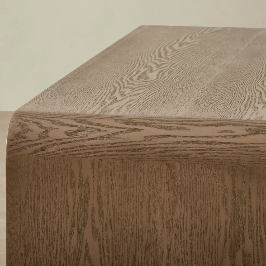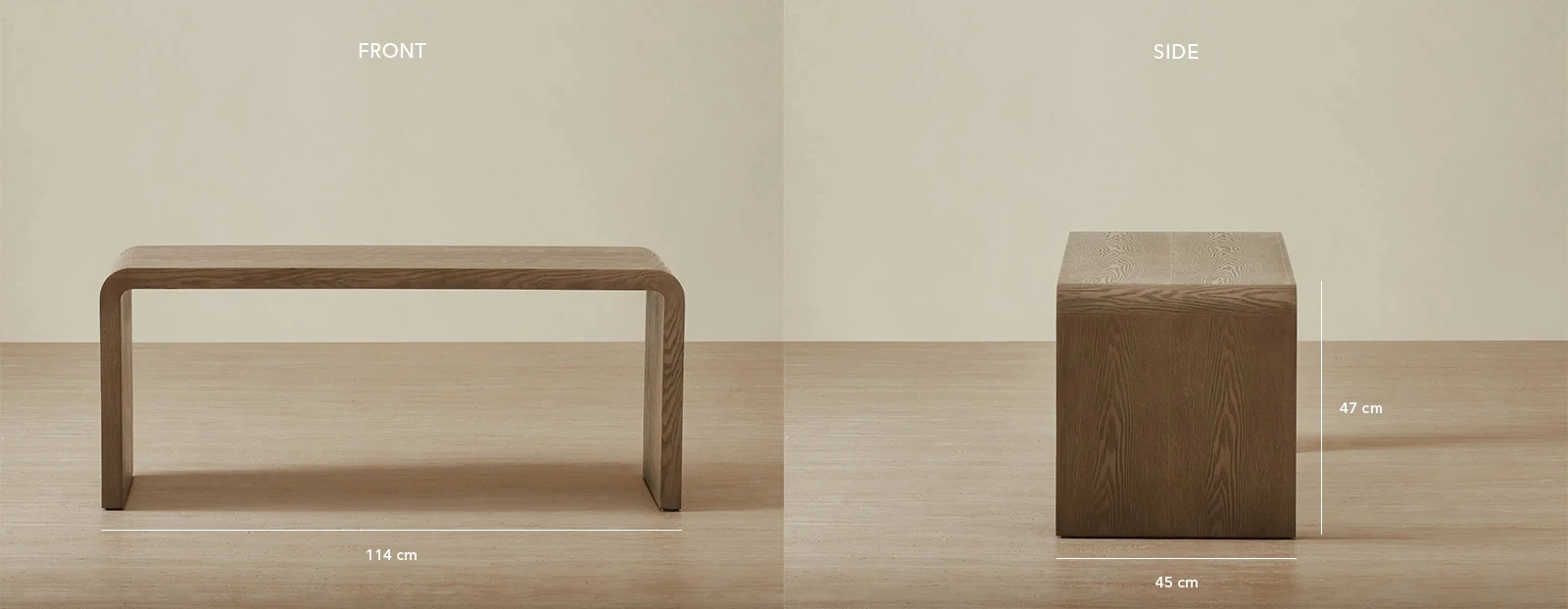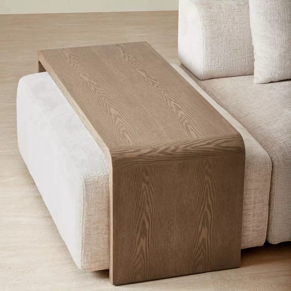 The sleek, curved shape is designed to slide neatly over a sofa or ottoman, offering a versatile surface for drinks, books, or decor.