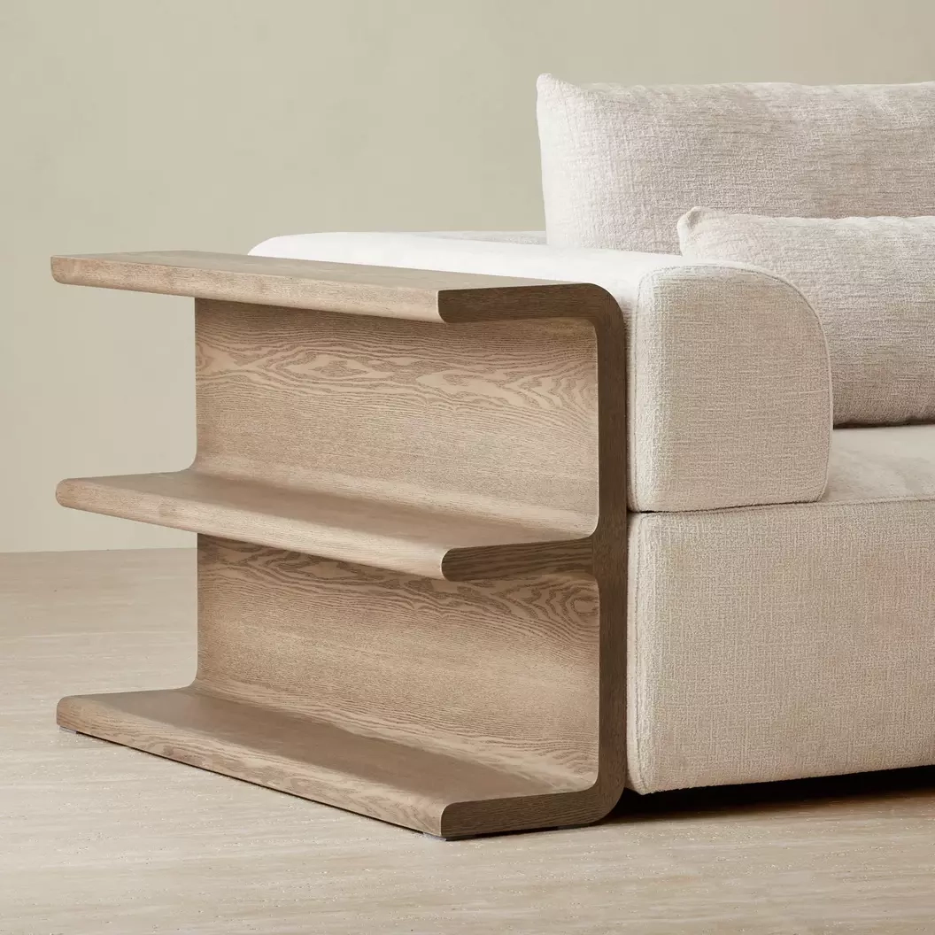 The sleek, curved profile is designed to fit perfectly a sofa arm, offering both convenience and style. Ideal for compact spaces, this shelf provides functional storage for books, decor, or essentials, enhancing your space with its contemporary elegance.