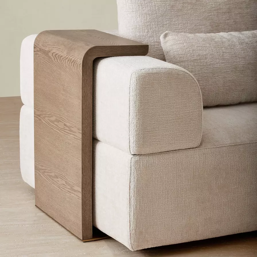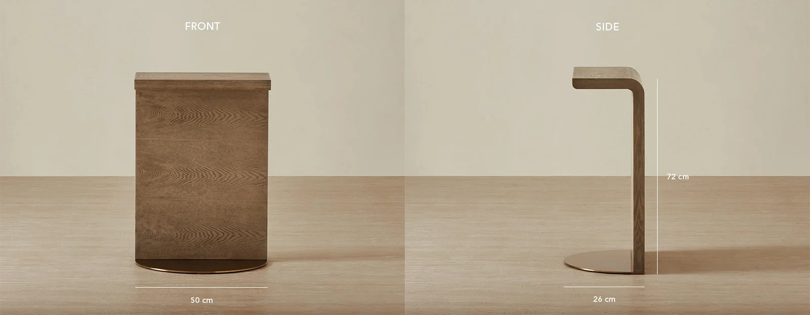 The sleek, curved profile is designed to fit over a sofa arm, offering convenience and style. Ideal for compact spaces, this table offers a functional surface for drinks, books, or decor, elevating your room with its contemporary elegance.