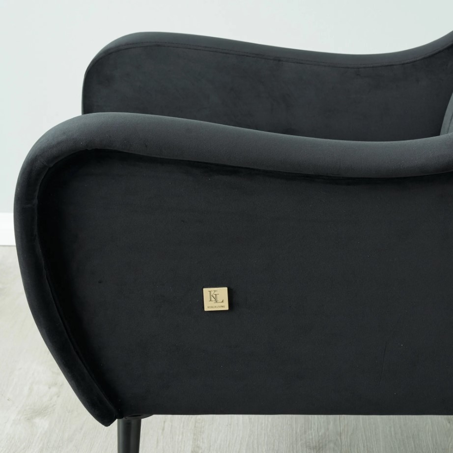 Upholstered in premium black velvet, the chair combines comfort with a luxurious aesthetic. Supported by four angled legs, it offers stability for relaxing in any position, making it both functional and elegant.