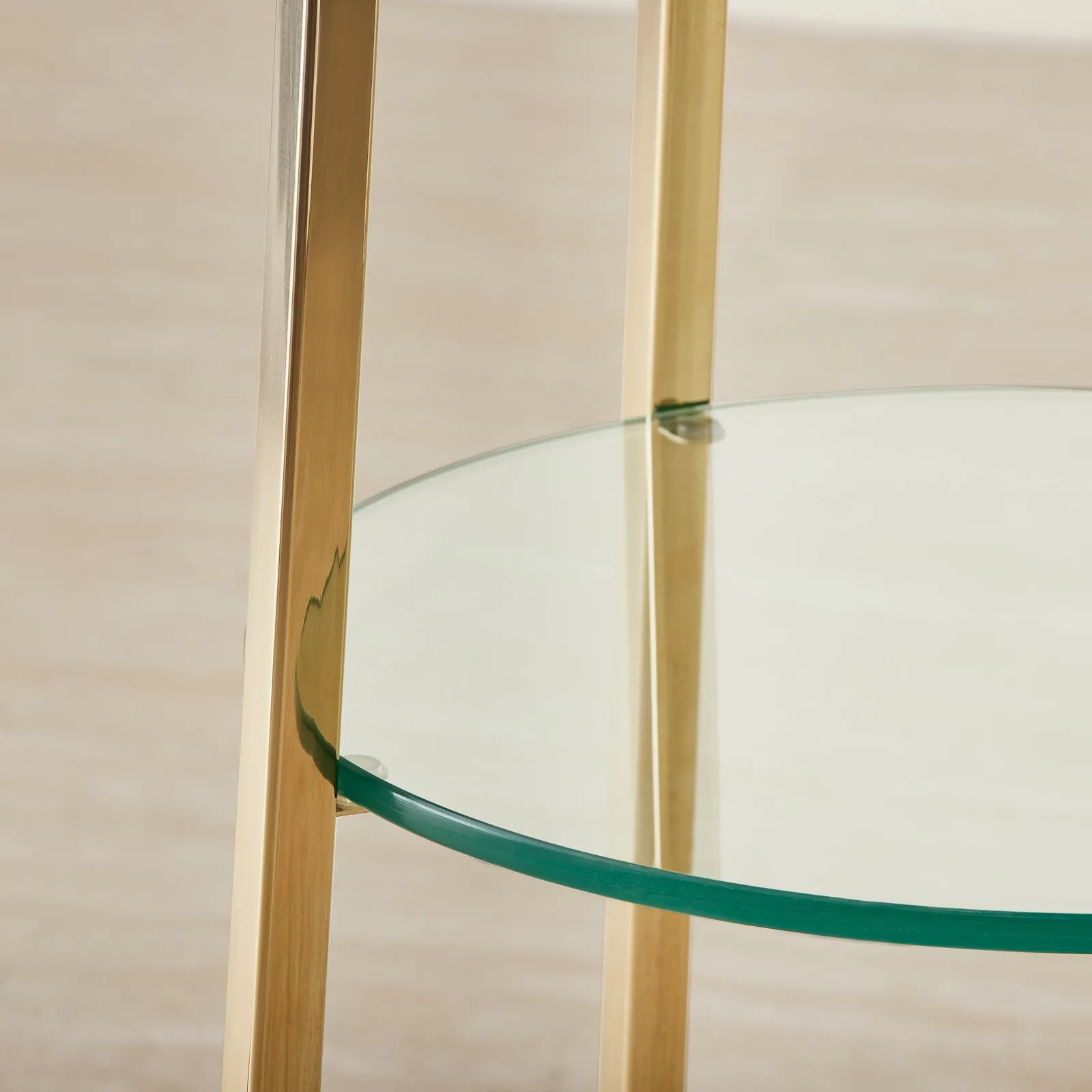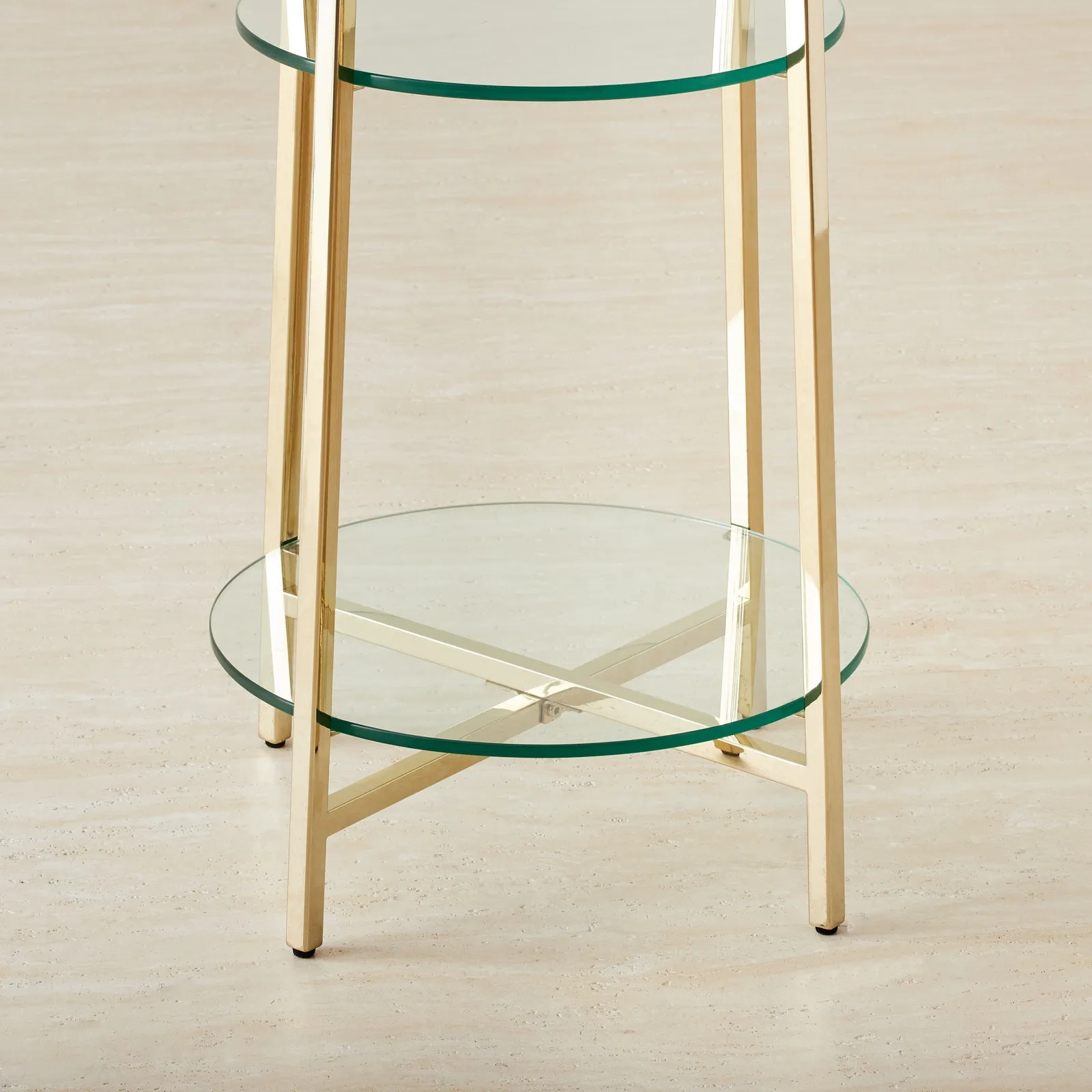 The Ruby Tiered Shelf brings sleek design and functional elegance to your home. Crafted from stainless steel and glass, it features four columns that create an open display space.