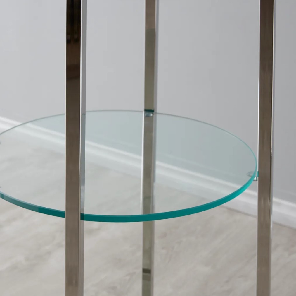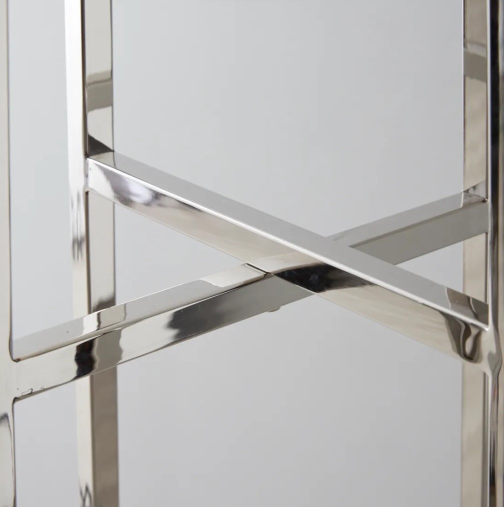 The Ruby Tiered Shelf brings a sleek design and functional elegance to your home. Crafted from stainless steel and glass, it features four columns that create an open display space.