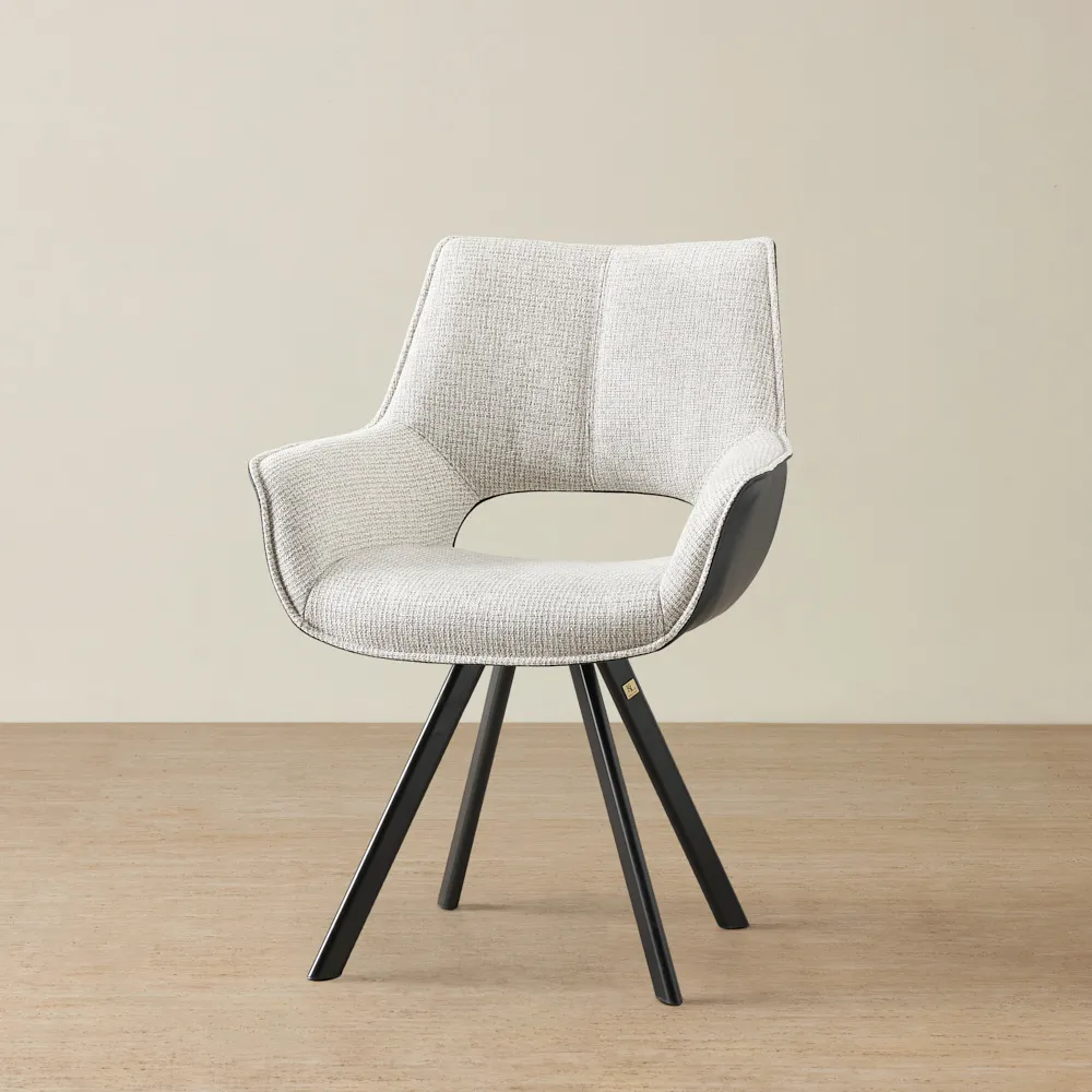 This feature also contributes to the chair's visual appeal, lending an element of spaciousness and modern flair. The structure of the chair is supported by four robust legs with a striking black finish that contrasts beautifully with the grey upholstery. The legs are splayed outwards, ensuring stability and adding an interesting geometric aspect to the overall design. Best when used in pairs along with one of our majestic dining tables.