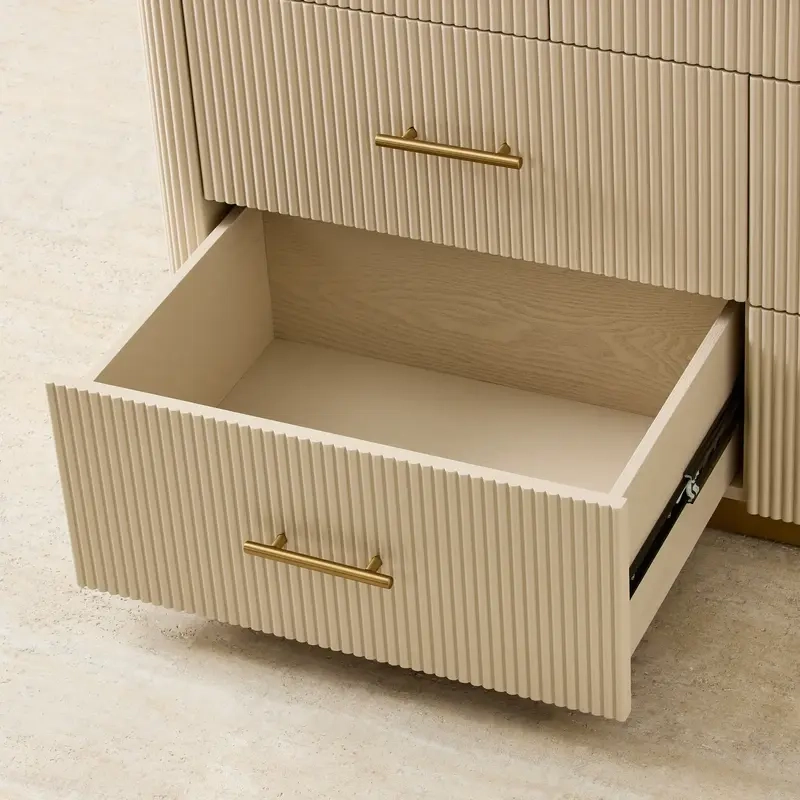 From dress-up afternoons to bedtime routines, the San Pierre Beige Paint Kids Bedroom Dresser is designed to handle it all. With six spacious drawers and a cheerful fluted exterior, it offers a playful and practical place to store clothing, costumes, and everyday essentials.