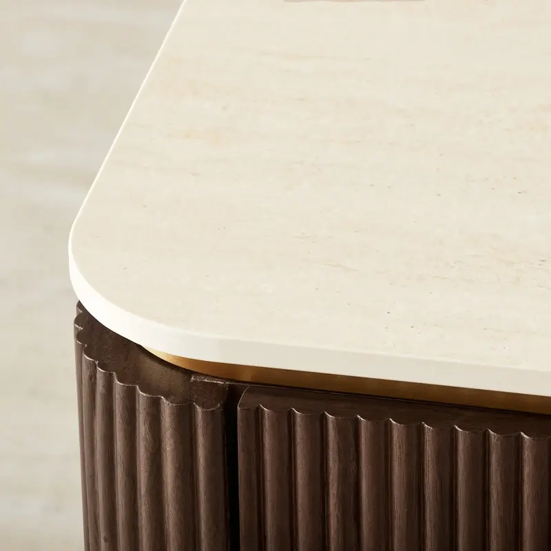Through the San Pierre collection, Koala Living showcases Emily McAlister's unique ability to draw inspiration from the past and seamlessly integrate it into modern design, creating pieces that are both timeless and contemporary. During her travels through ancient streets, Emily was mesmerized by the vibrant fusion of history and modernity. Inspired by towering columns, intricate metalwork, and enchanting aromas, she meticulously wove these elements into the San Pierre collection. Each table in this collection features a sintered stone top with a travertine finish, beautifully reflecting the timeless charm of aged architecture. The base of each table, designed with walnut veneer creating vertical reeding, adds a dynamic and sophisticated presence. Emily's design philosophy places a strong emphasis on functionality and human connection. This is evident in the San Pierre collection, where each piece is crafted to enhance everyday moments and bring a touch of elegance to any space. The well-crafted tables in the collection are not only visually stunning but also highly practical, embodying Emily's vision of creating designs that are both beautiful and useful.