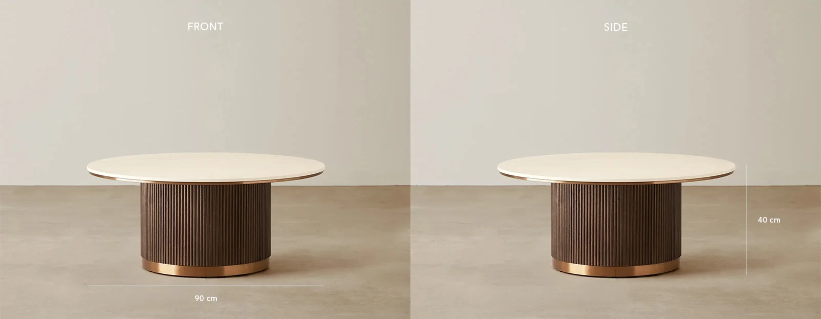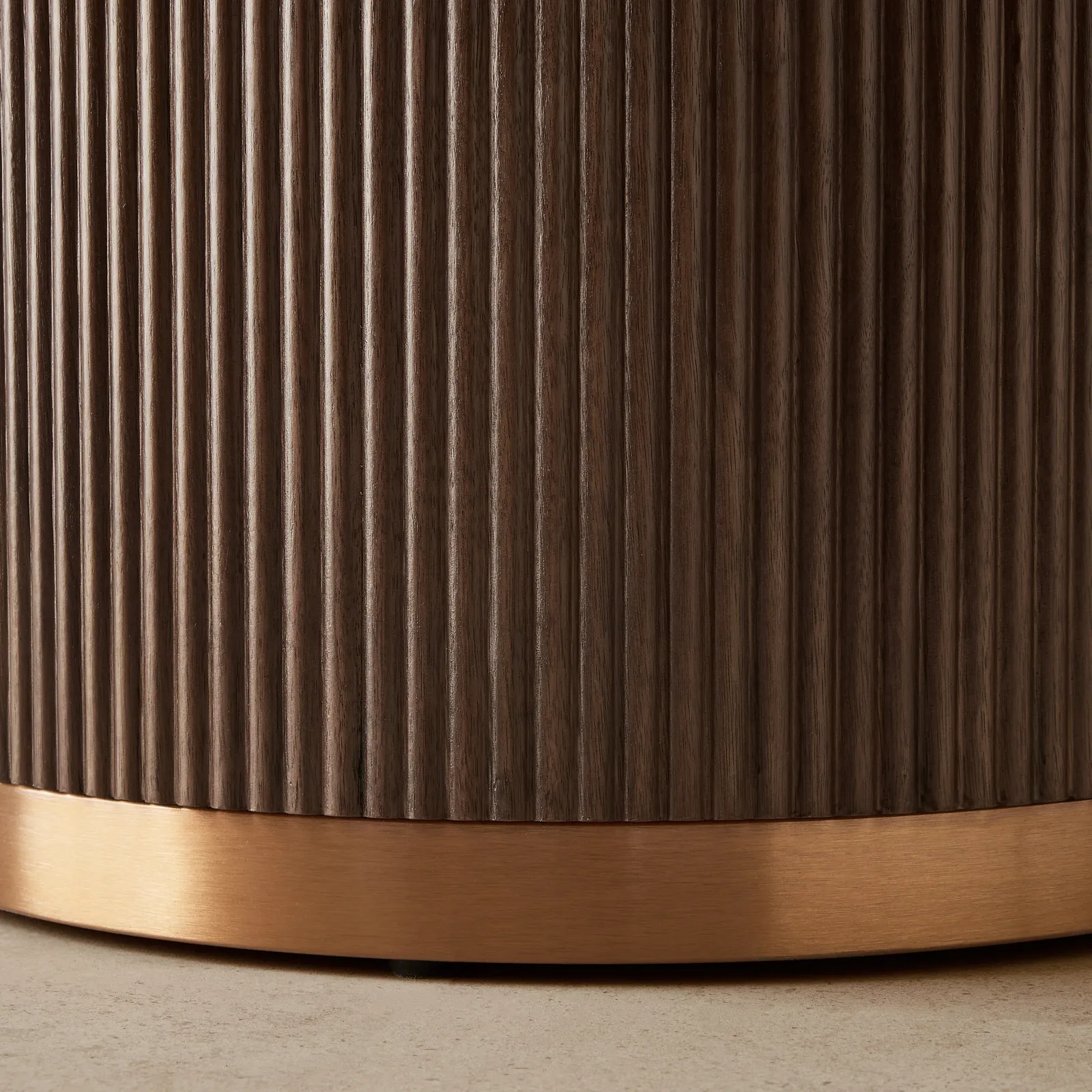 Its rounded design brings a sense of flow and unity to the living room. The rich ebony brown ash veneer base, accentuated by vertical reeding, perfectly complements its grandiose tabletop.