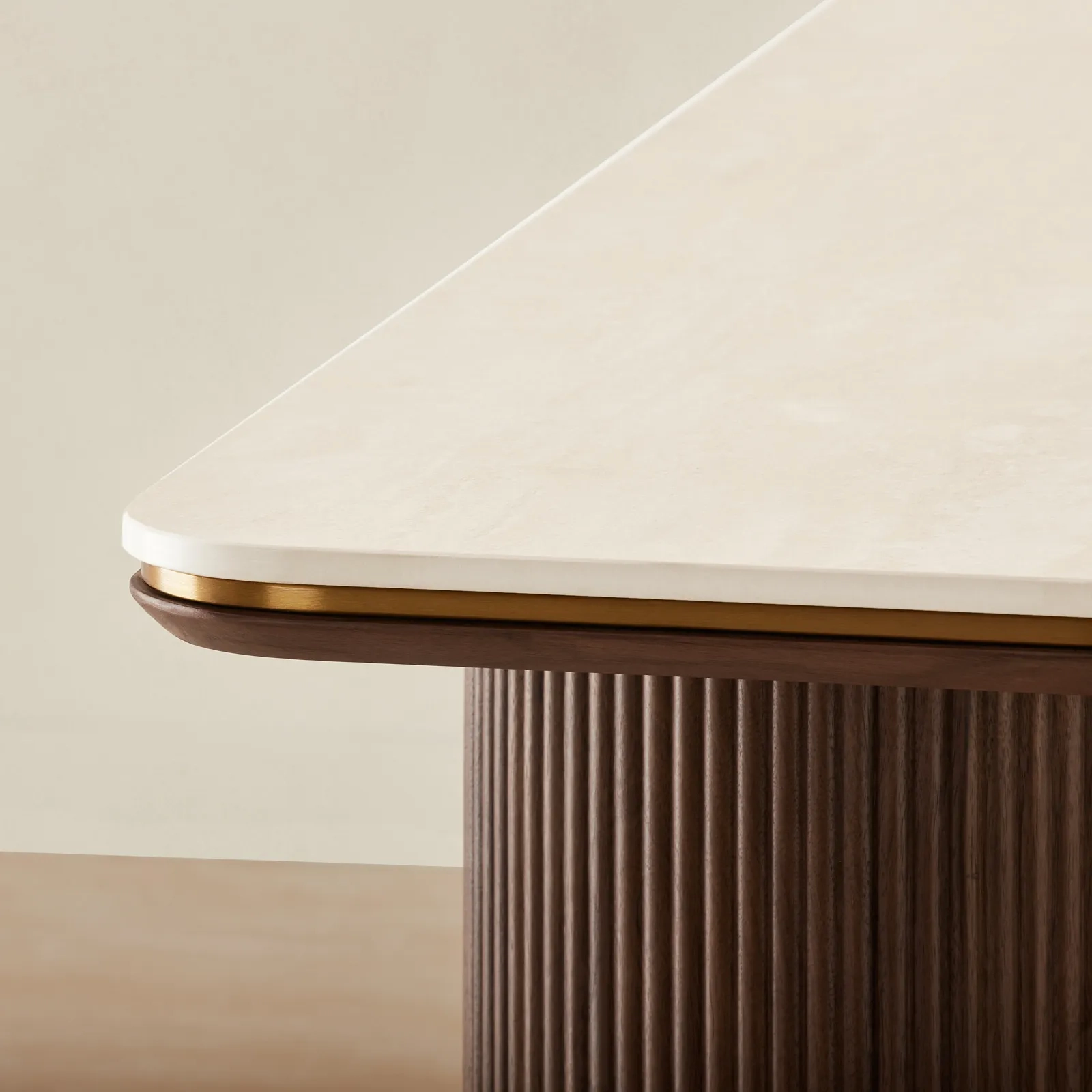 Its ebony brown ash veneer columns, adorned with vertical reeding, add depth and sophistication, making the piece a true statement. The golden accents on the base and edges highlight the table’s refined aesthetic.