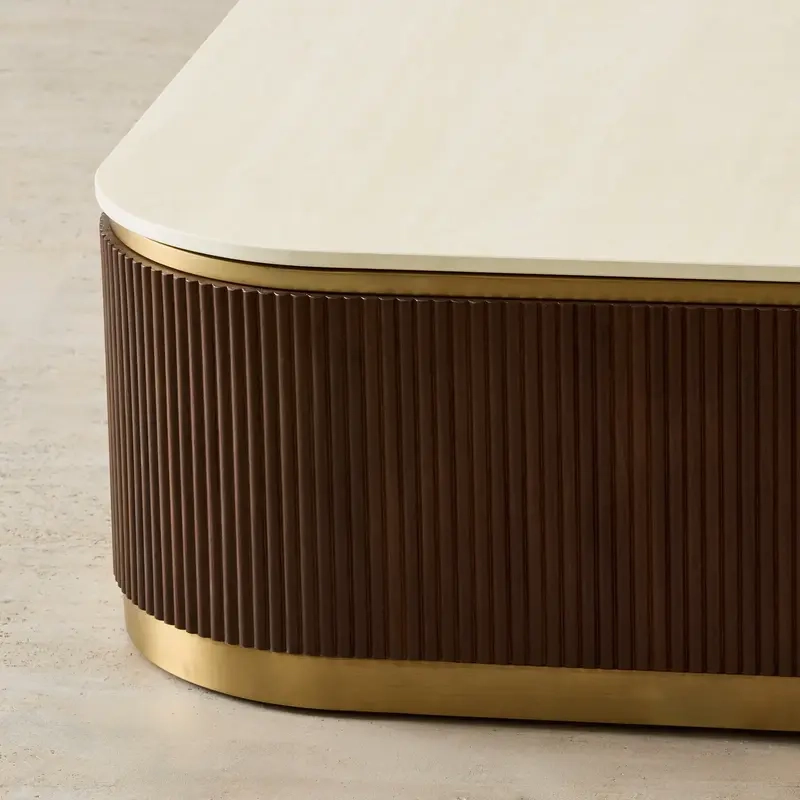 The San Pierre Coffee Table captivates with its luxurious cream travertine finish sintered stone top. Its smooth, rounded edges soften the strong rectangular form, creating a balanced centerpiece for modern living spaces.